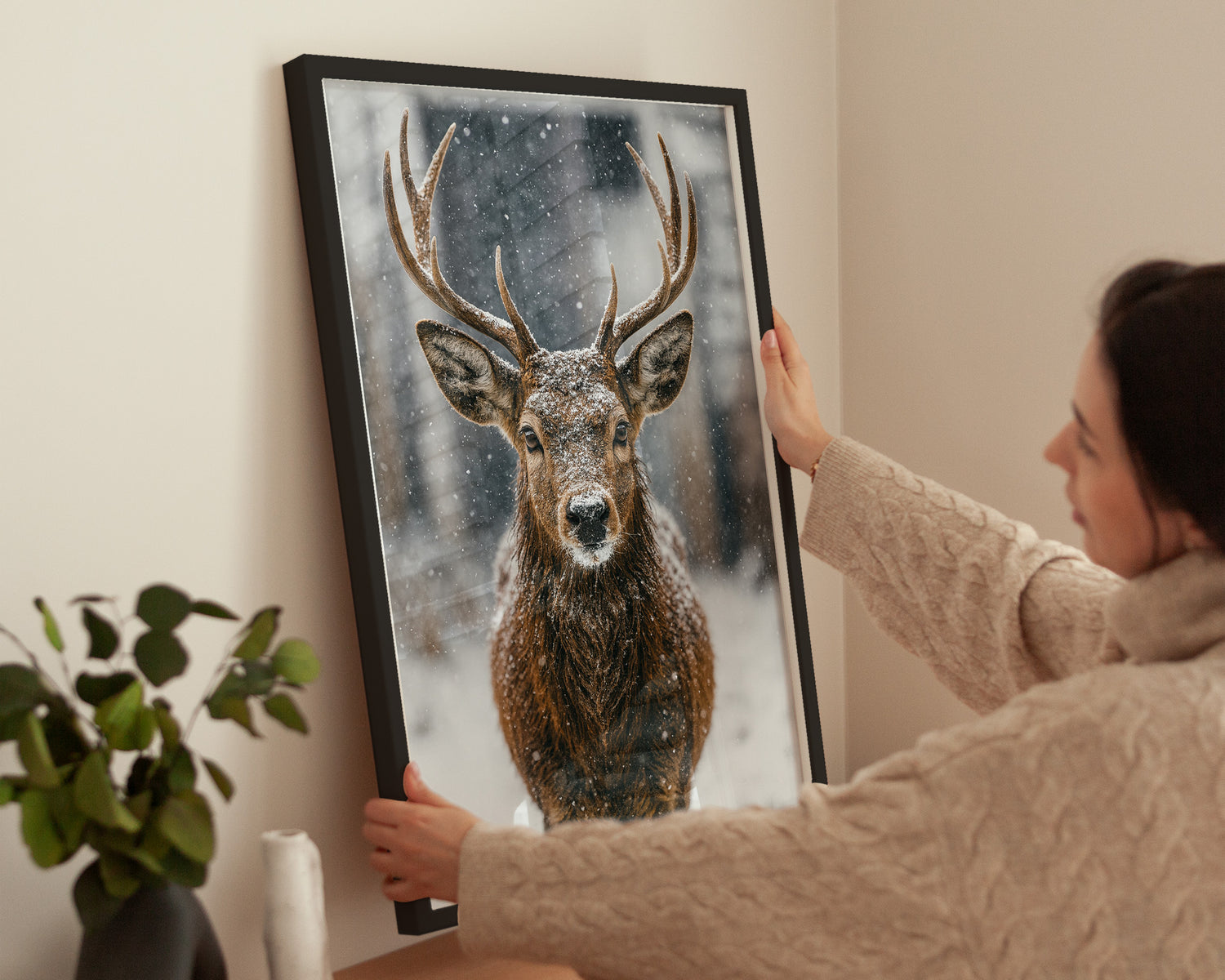 Nahaufnahme eines Hirsches im Winter. Ein eindrucksvolles Tiermotiv, das Stärke, Natürlichkeit und winterliche Atmosphäre verkörpert.