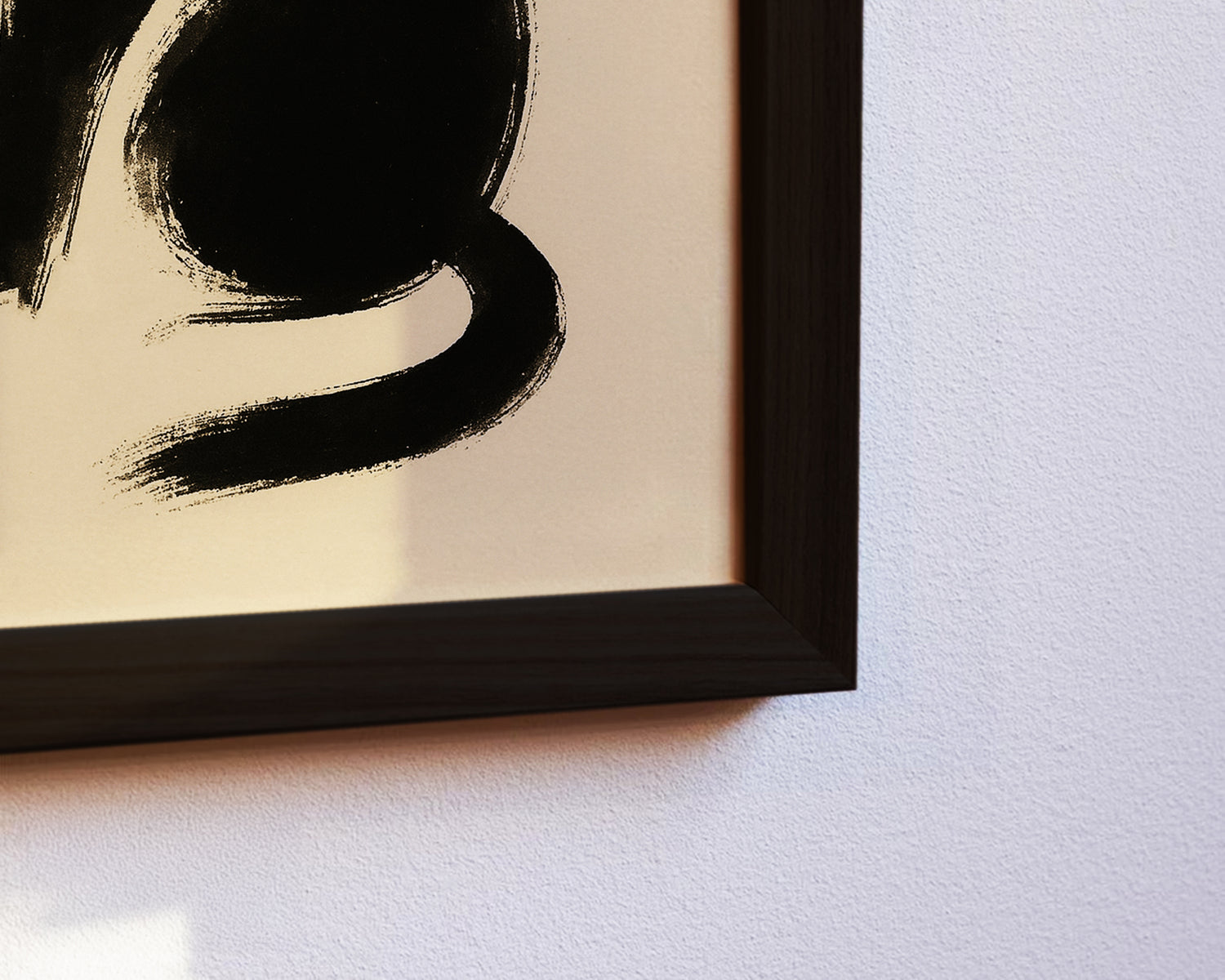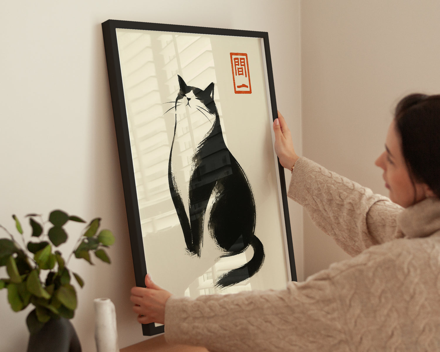 Die erhobene Haltung dieser Zen-Katze steht für Selbstvertrauen und Würde. Die reduzierte Tuschetechnik bringt Konzentration und Ausdruck auf den Punkt – ein stilles Highlight für moderne Wohnkonzepte.