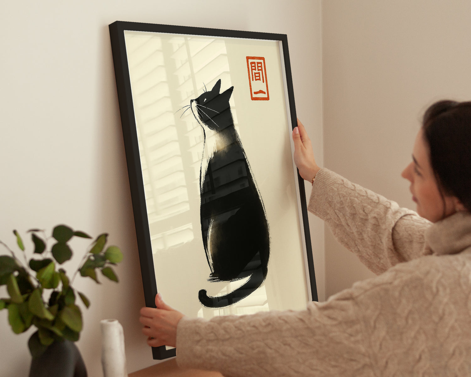 Diese Katze blickt über das Offensichtliche hinaus. Die seitliche Perspektive, kombiniert mit der traditionellen Tuschetechnik, schafft Raum für Stille, Achtsamkeit und Weite im Denken.