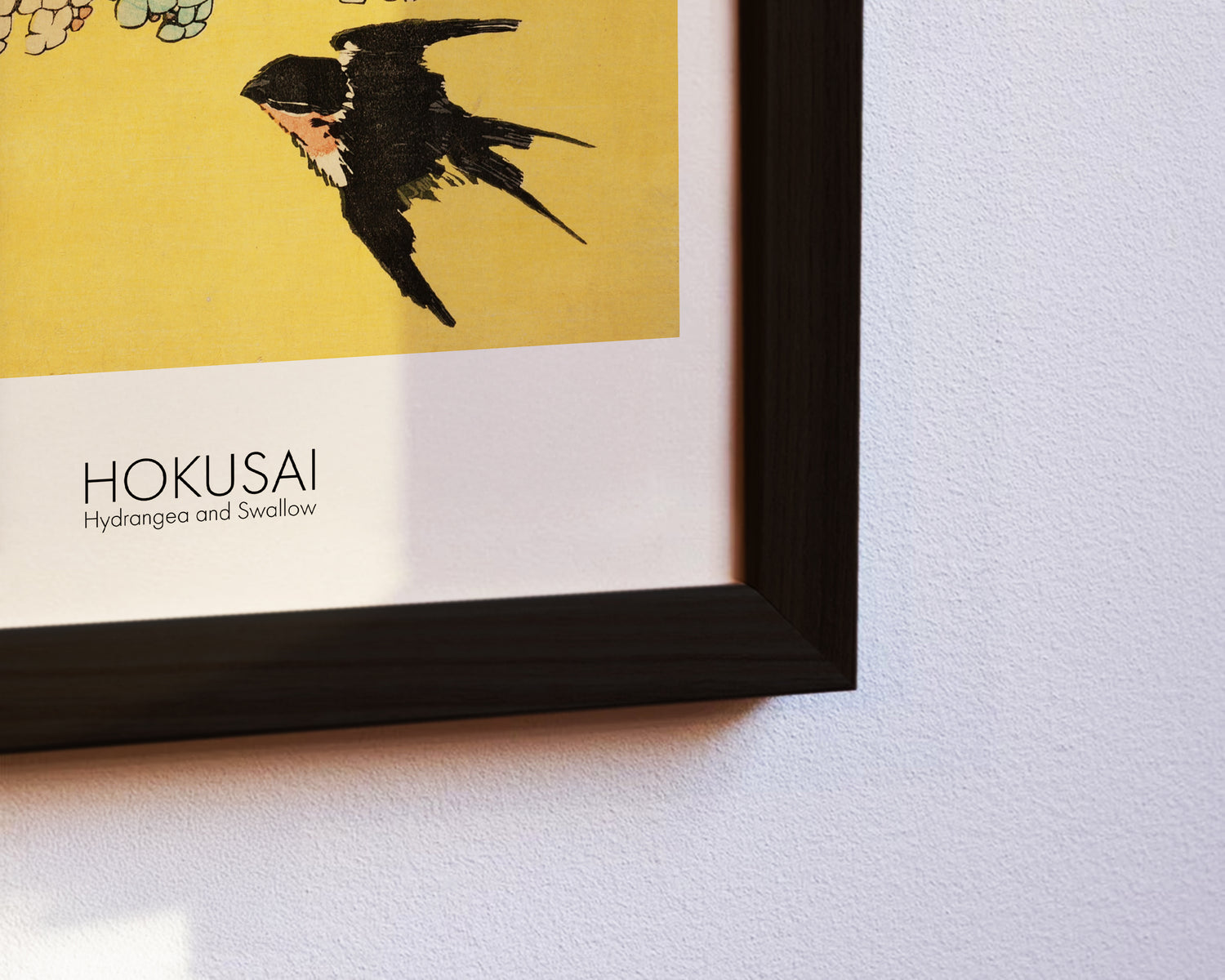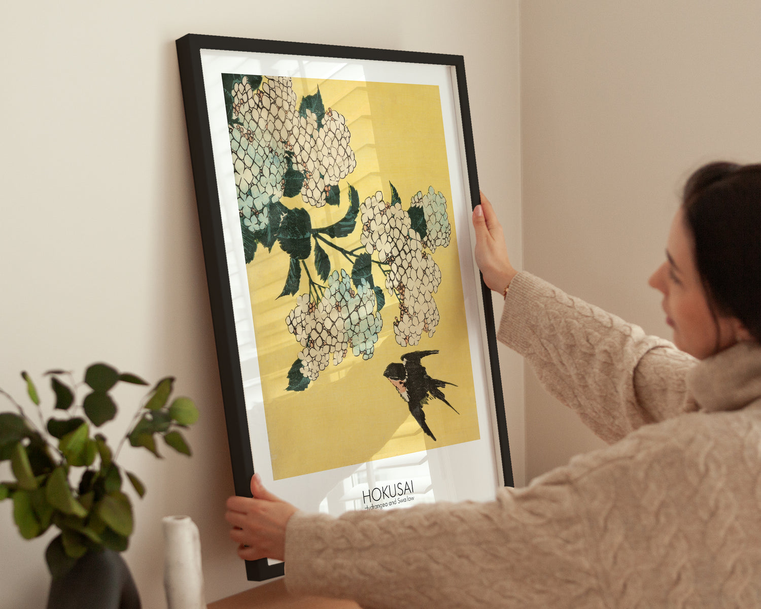 Hokusai Gemälde: „Hydrangea and Swallow“ (ca. 1834), ein Werk des Ukiyo-e (Edo-Zeit). Ursprünglich von Hokusai gemalt. Entdecke mehr von seiner Kunst in unserer Kategorie Berühmte Kunstwerke. Künstler: Hokusai
