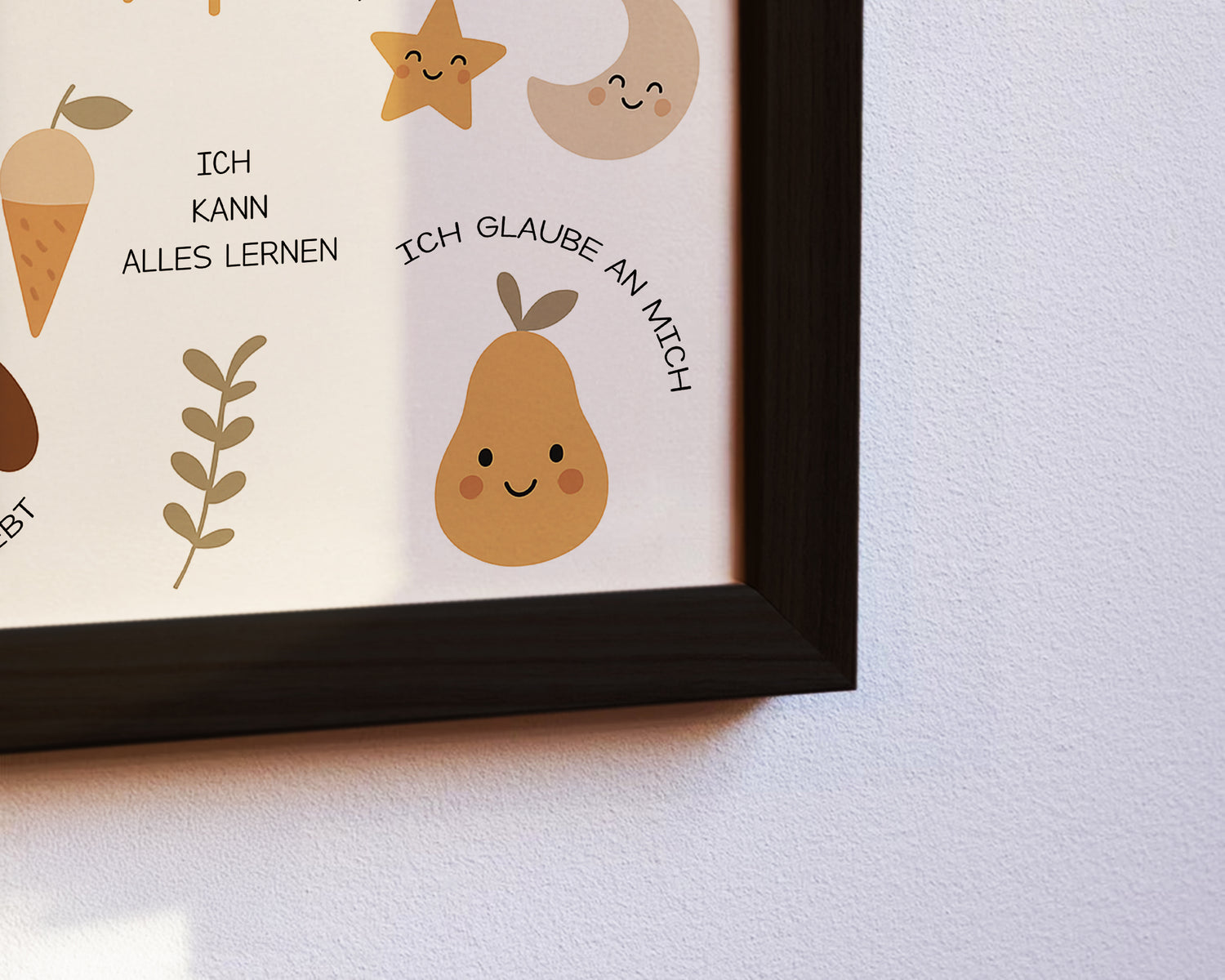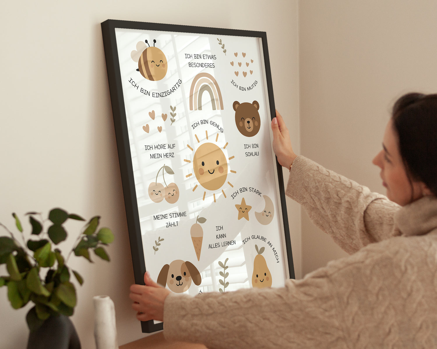 Dieses Kinder Affirmationen Poster zeigt liebevoll gestaltete Sprüche wie Ich bin stark, Ich bin einzigartig oder Meine Stimme zählt, umgeben von süßen Motiven wie Sonne, Bär, Hund und Birne. Perfekt für das Kinderzimmer, um täglich Mut und Selbstvertrauen zu schenken und den Raum freundlich und modern zu gestalten.
