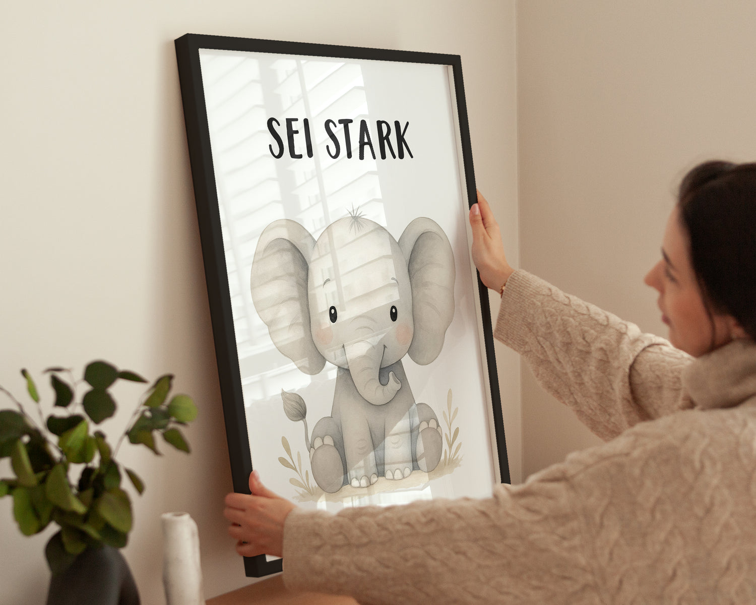 Dieses Kinder Affirmation Poster zeigt einen niedlichen Elefanten zusammen mit der Botschaft Sei stark. Es ist liebevoll illustriert und bringt eine sanfte, positive Stimmung ins Kinderzimmer oder Babyzimmer. Die Affirmation ermutigt Kinder, an ihre eigene Stärke zu glauben und selbstbewusst durchs Leben zu gehen. Das Poster passt perfekt über Bett, Wickeltisch oder Spielecke und ist ein tolles Geschenk zur Geburt, Taufe oder zum Geburtstag. Es kombiniert modernes Kinderzimmer Design mit wertvoller, motivierender Botschaft.