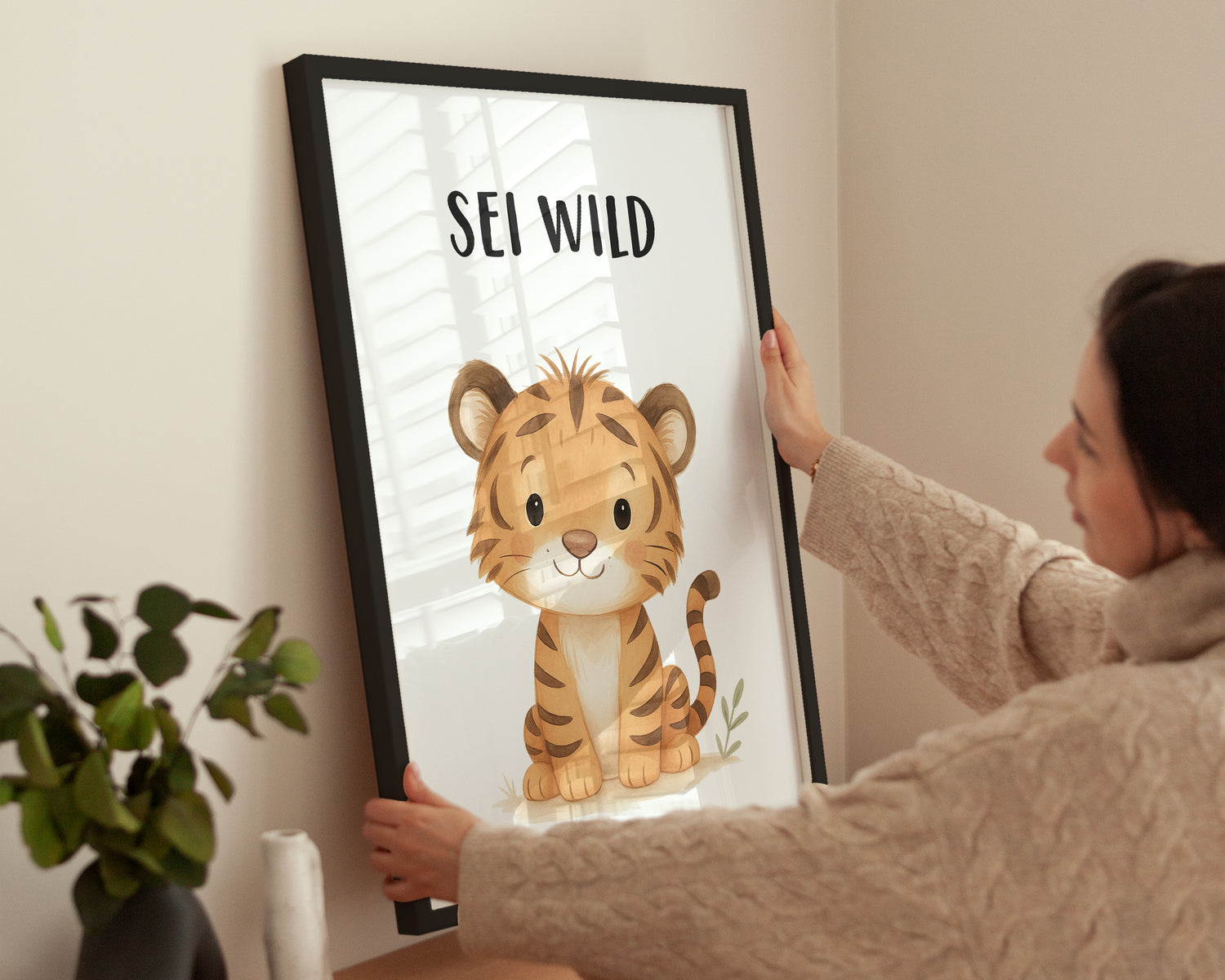 Dieses liebevoll illustrierte Kinder Affirmation Poster zeigt einen verspielten Tiger zusammen mit dem Spruch Sei wild. Die fröhliche Zeichnung und die warmen Farben laden Kinder ein, neugierig zu bleiben, mutig zu entdecken und sich auszuleben. Eine wunderbare Wanddekoration fürs Kinderzimmer oder Babyzimmer, die täglich Freude und Abenteuerlust vermittelt. Ideal als Geschenk zur Geburt, Taufe oder für kleine Tiger-Fans.