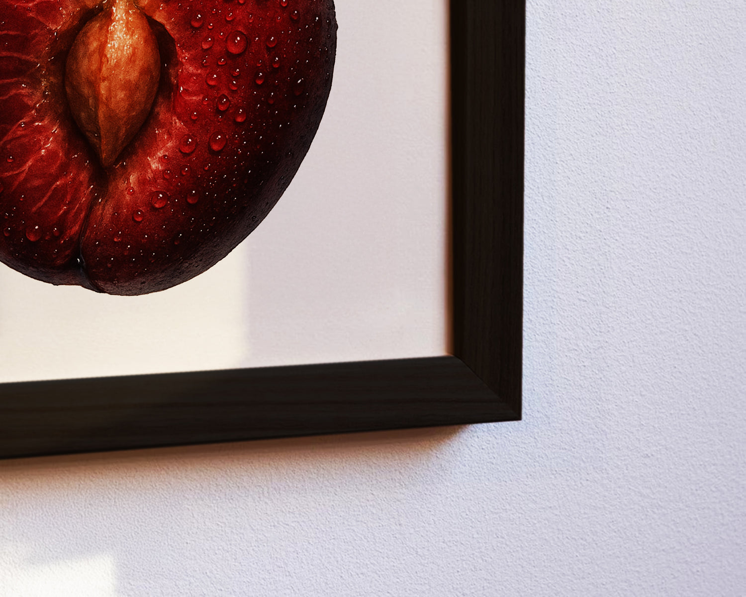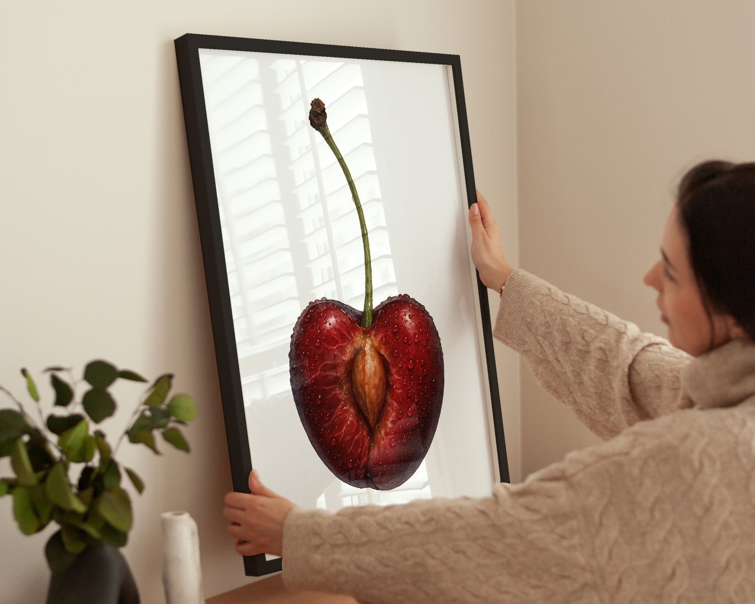 Dieses stilvolle Poster zeigt eine halbierte Kirsche mit sichtbarem Kern. Die feine Illustration bringt natürliche Eleganz in Küche, Esszimmer oder moderne Wohnräume. Wahlweise mit schwarzem oder weißem Rahmen erhältlich. Keywords: Kirsche halbiert Poster, Frucht Kunst, Wanddeko Küche.