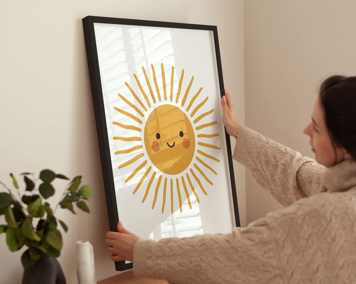 Das Poster Sunshine bringt Licht und gute Laune ins Kinderzimmer. Die lachende Sonne mit weichen Strahlen sorgt für eine warme Atmosphäre und ein Gefühl von Geborgenheit. Ideal für kleine Sonnenanbeter und als freundlicher Blickfang an der Wand.