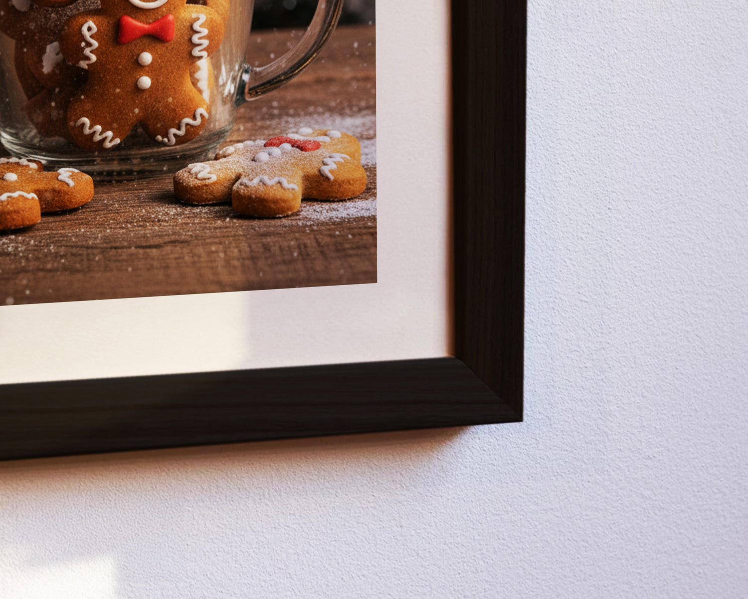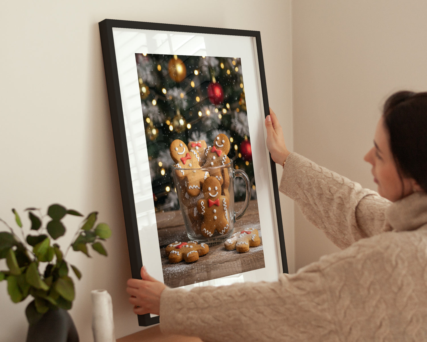 Dieses Poster zeigt eine Tasse voller Lebkuchen-Männchen vor einem geschmückten Weihnachtsbaum. Die warme Bildstimmung und süße Details machen es zu einem perfekten Weihnachtsmotiv für eine gemütliche Atmosphäre.