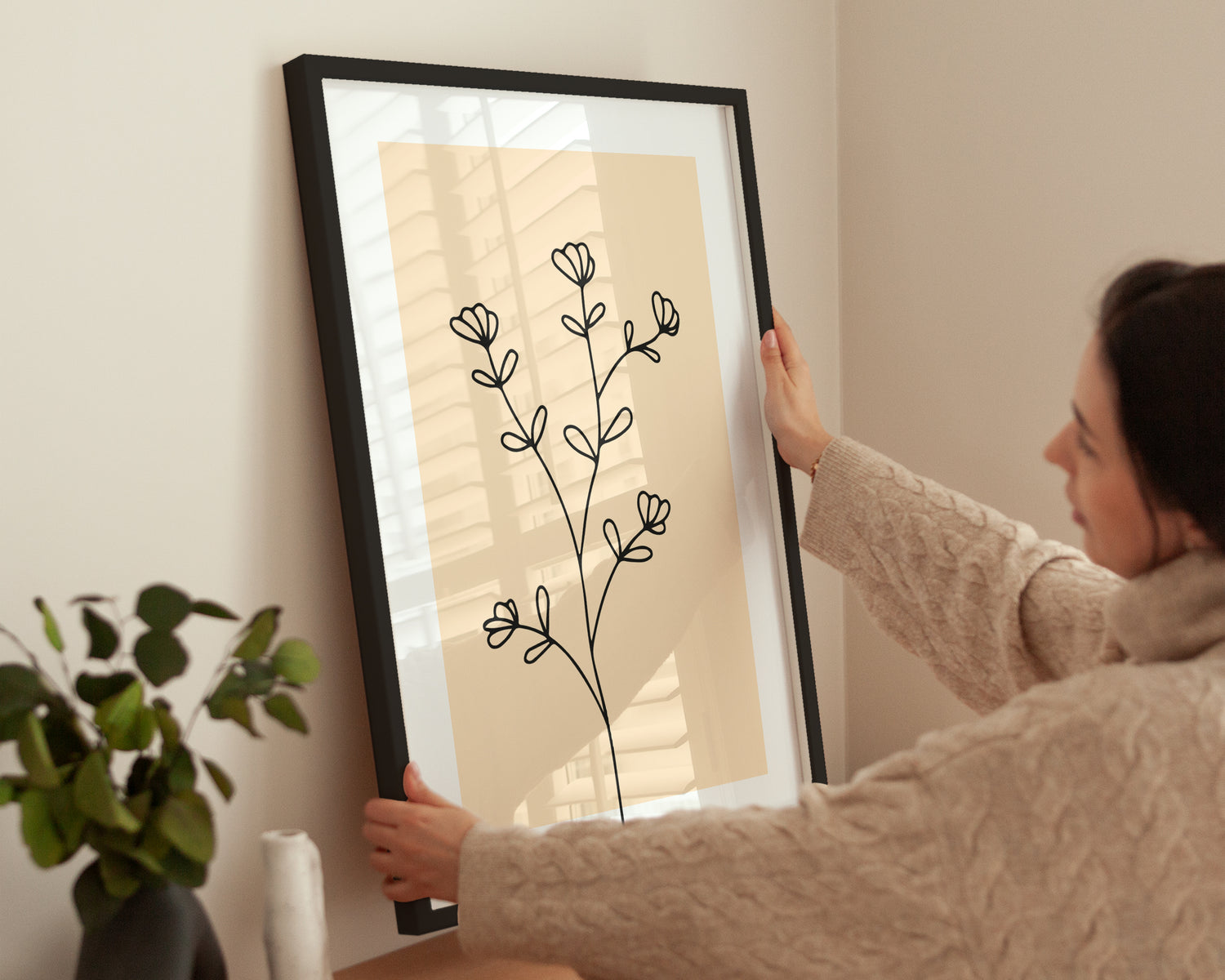 Dieses elegante Line Art Poster zeigt drei stilisierte Blumen, fein gezeichnet auf einem warmen beigefarbenen Hintergrund. Die Kombination aus minimalistischer Linienführung und natürlicher Farbgebung verleiht dem Motiv eine zeitlose Eleganz, die in moderne und skandinavische Wohnkonzepte gleichermaßen passt. Es eignet sich perfekt, um Räumen einen Hauch von Leichtigkeit und künstlerischer Raffinesse zu verleihen. Der hochwertige Druck auf erstklassigem Papier betont die feinen Konturen und sorgt für eine lange Haltbarkeit. Ideal als Einzelstück oder in Kombination mit weiteren Line-Art-Motiven für harmonische Wandgalerien.