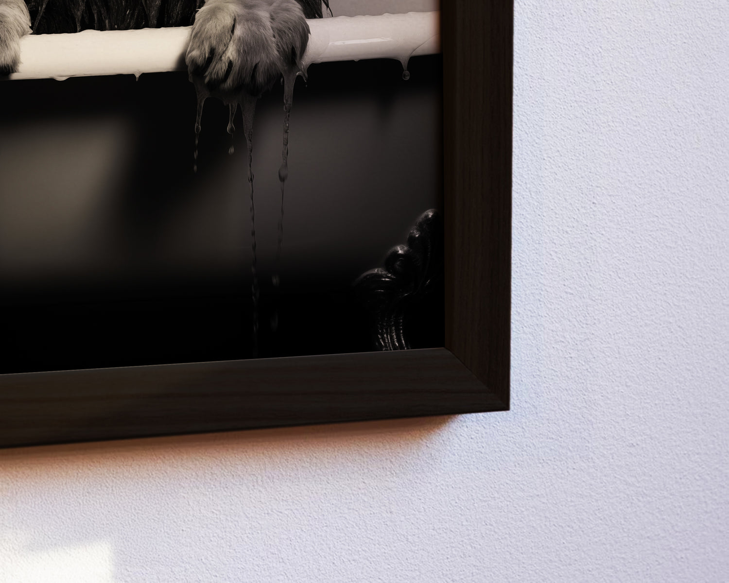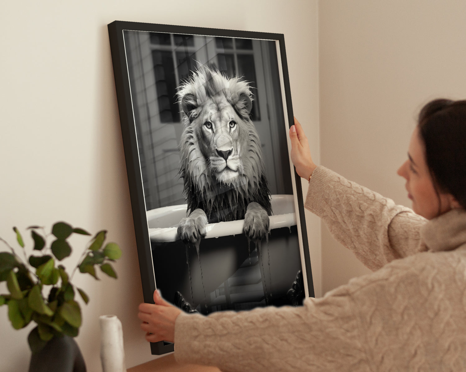 Ein Löwe beim Baden. Dieses Poster in Schwarz-Weiß ist ein tierisch witziger Hingucker fürs Bad.