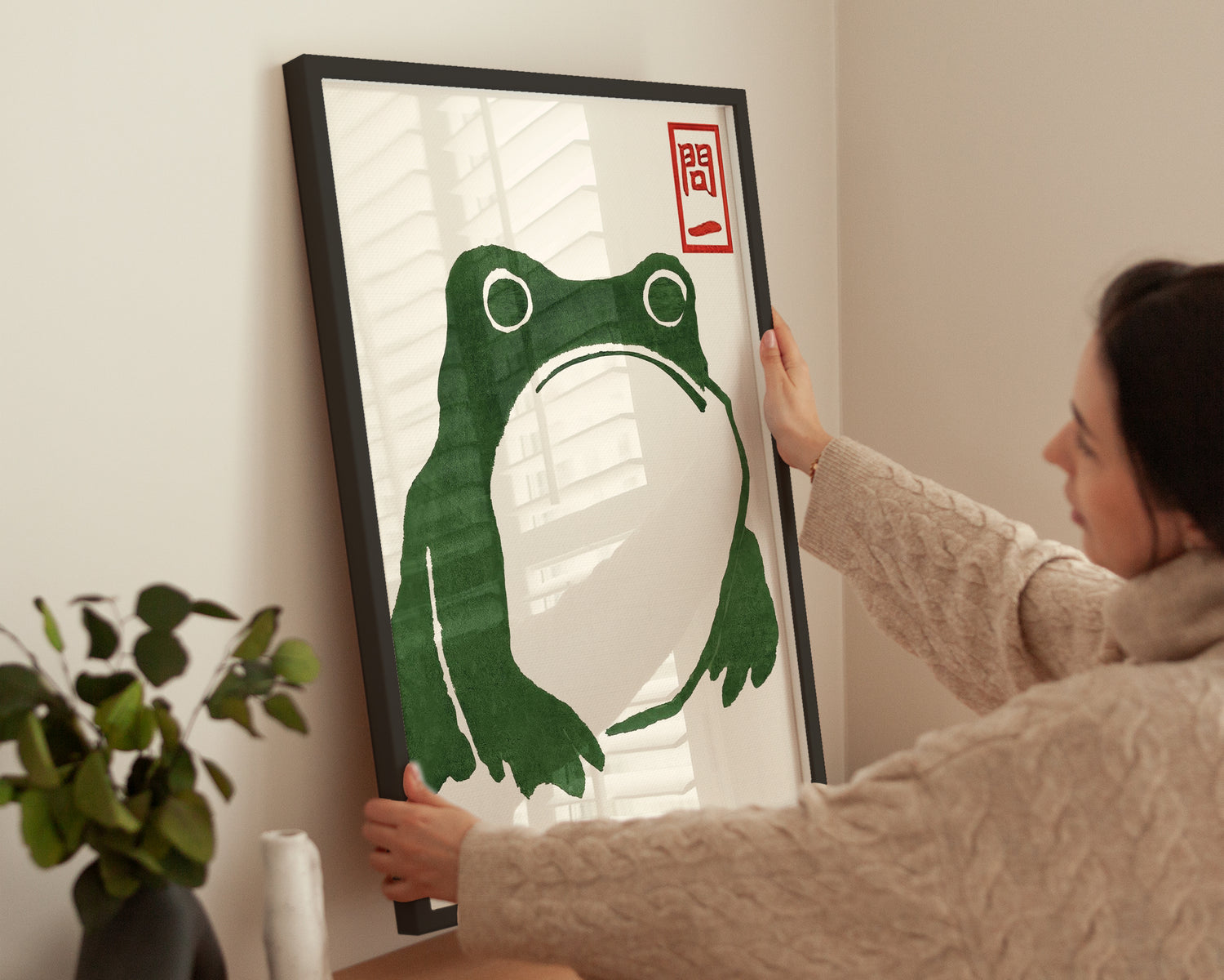 Diese minimalistische Hoji Frog Illustration von Matsumoto Hoji zeigt einen grünen Frosch in klarer, reduzierter Linienführung auf hellem Hintergrund. Im japanischen Sumi-e Stil gefertigt, bringt das Kunstwerk Ruhe, Zen und fernöstliche Ästhetik an deine Wände. Perfekt für moderne Wohnräume, die traditionelle japanische Kunst und zeitlose Designs vereinen möchten.