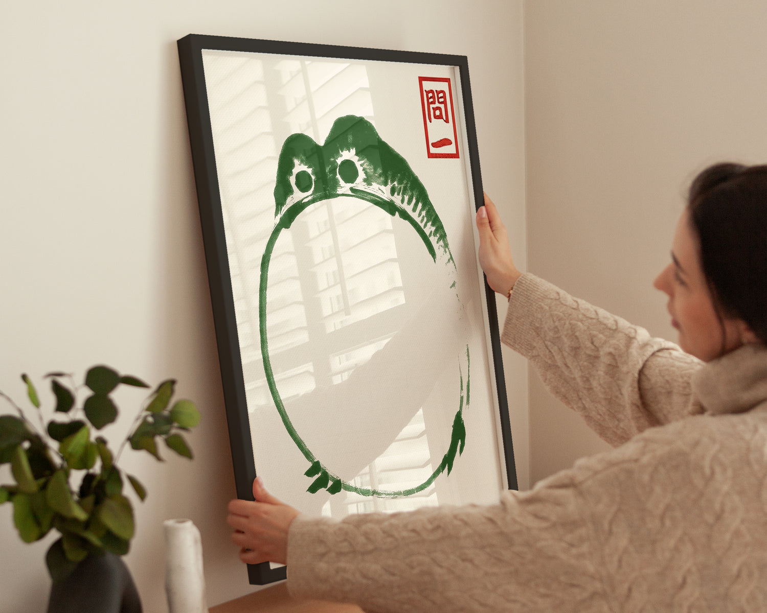 Die runde Zen Hoji Frog Illustration von Matsumoto Hoji ist ein Paradebeispiel japanischer Sumi-e Kunst. Mit einem einfachen, kraftvollen Pinselstrich formt sie einen meditativen Frosch, der Balance und Harmonie verkörpert. Perfekt für Räume, die minimalistische Kunst und fernöstliche Ästhetik verbinden wollen.