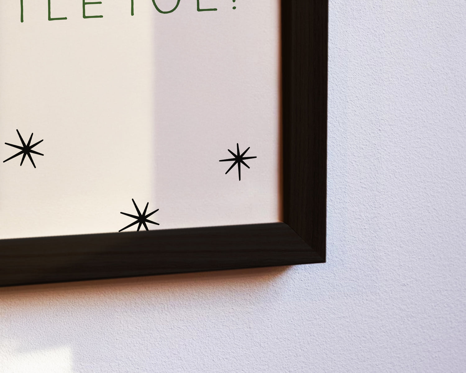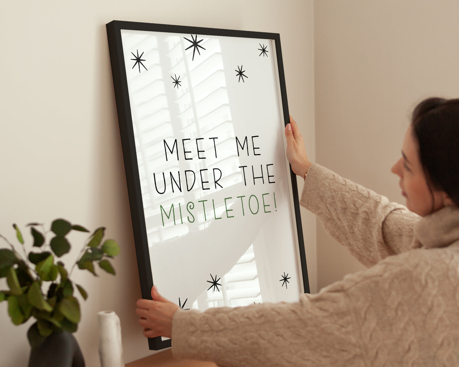 Minimalistisches Weihnachts-Poster mit dem Schriftzug „Meet Me Under The Mistletoe!“ in moderner Schriftgestaltung. Perfekt als dekoratives Element für die Advents- und Weihnachtszeit. Das schlichte Design passt in nahezu jeden Einrichtungsstil und sorgt für einen stilvollen, humorvollen Akzent. Gedruckt auf hochwertigem, mattem Premium-Papier überzeugt das Poster durch gestochen scharfe Typografie, langlebige Farben und eine klare Gestaltung, die Ihre festliche Wanddekoration perfekt ergänzt.