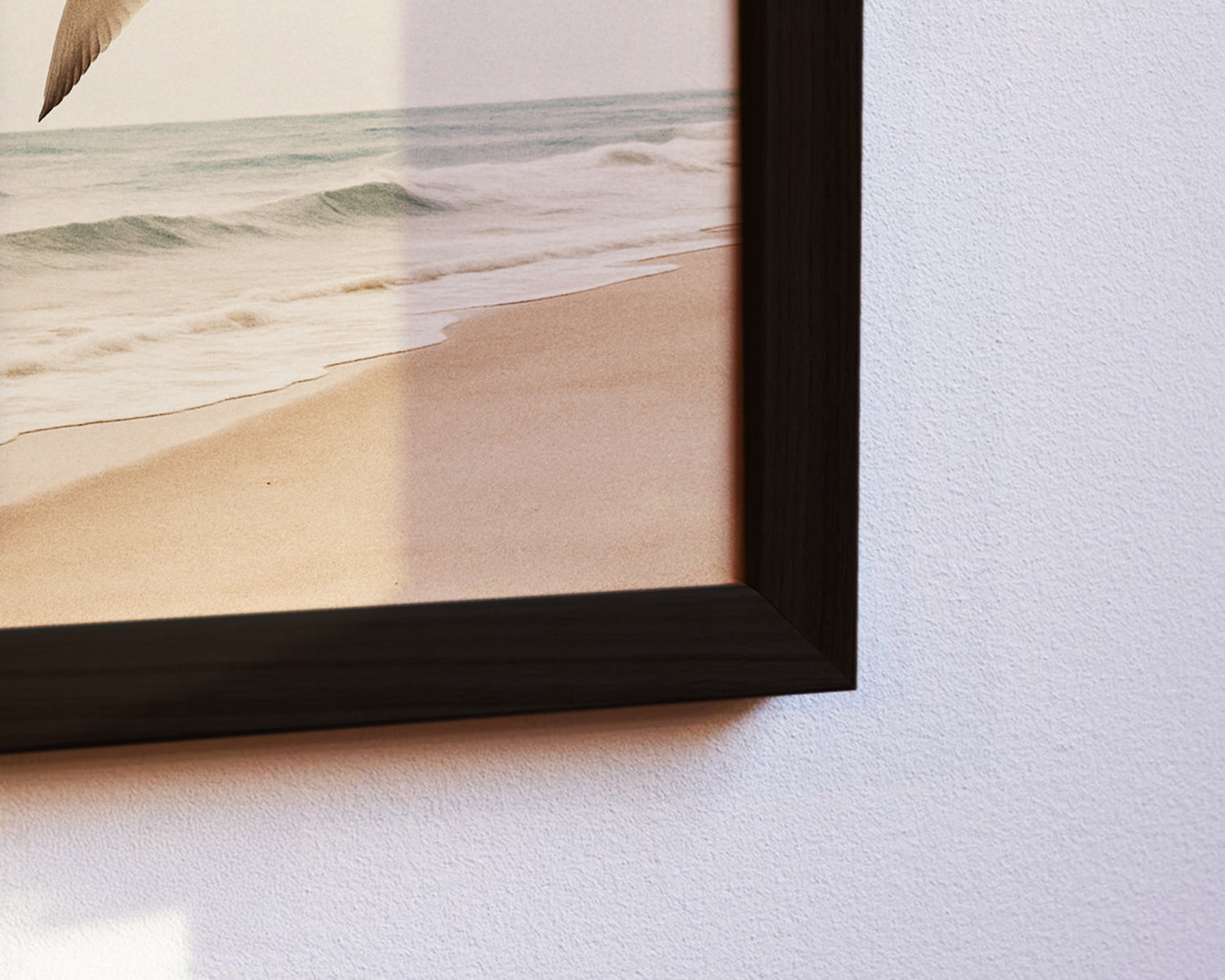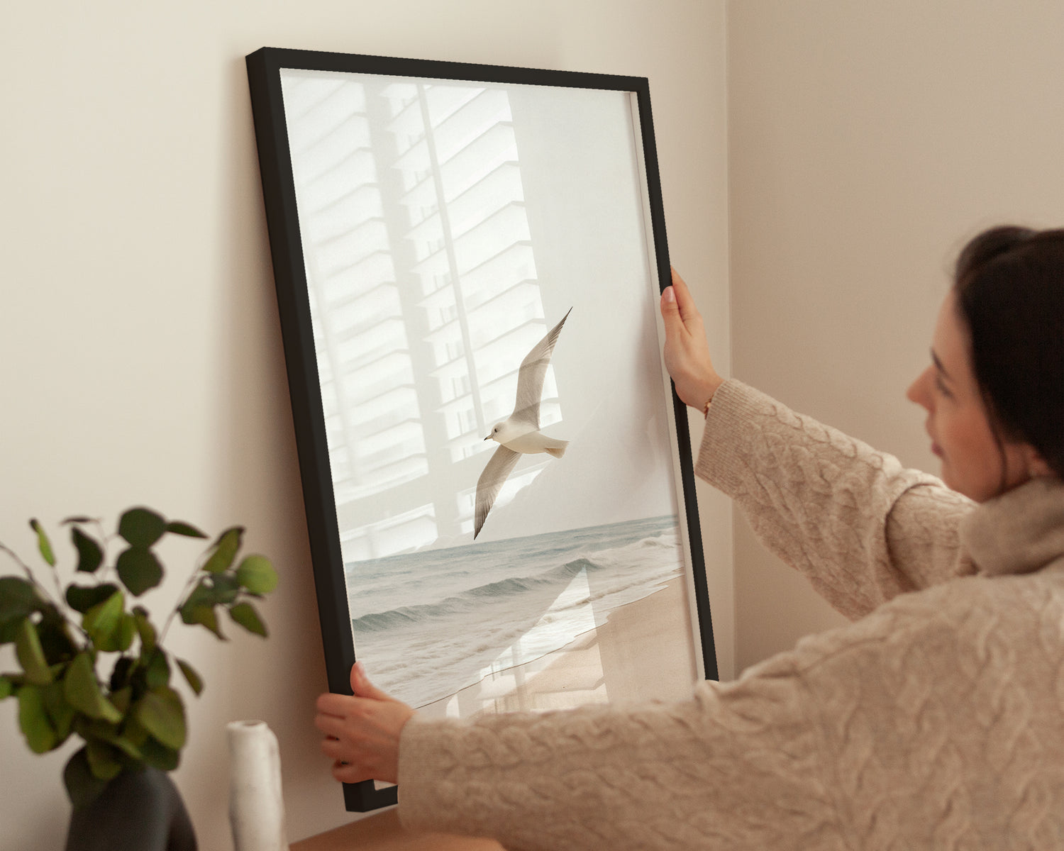 Die fliegende Möwe über dem ruhigen Meer steht für Freiheit und Leichtigkeit. Dieses Poster bringt den Klang des Meeres und das Gefühl der Küstenbrise direkt in deinen Wohnraum.