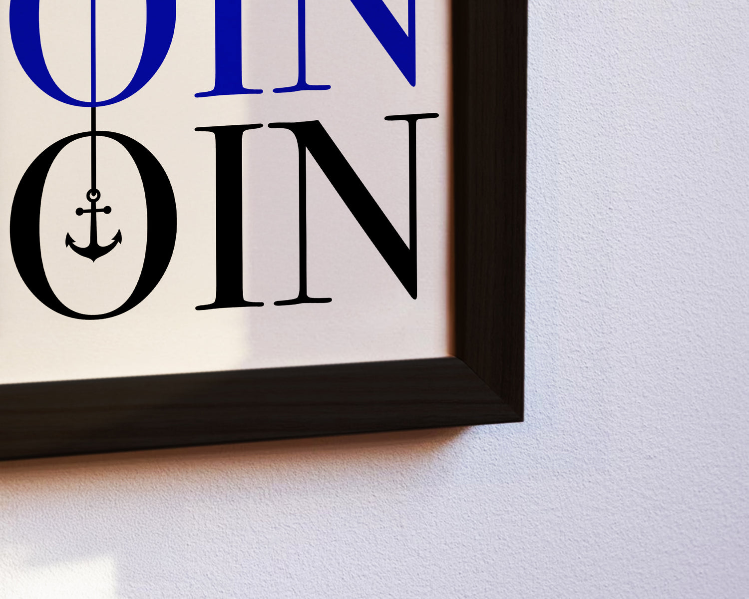 Typografie-Poster mit dem Wort „MOIN“ in vier Reihen, von hellblau bis schwarz, darunter ein Anker. Ein nordisch inspiriertes Wandbild.