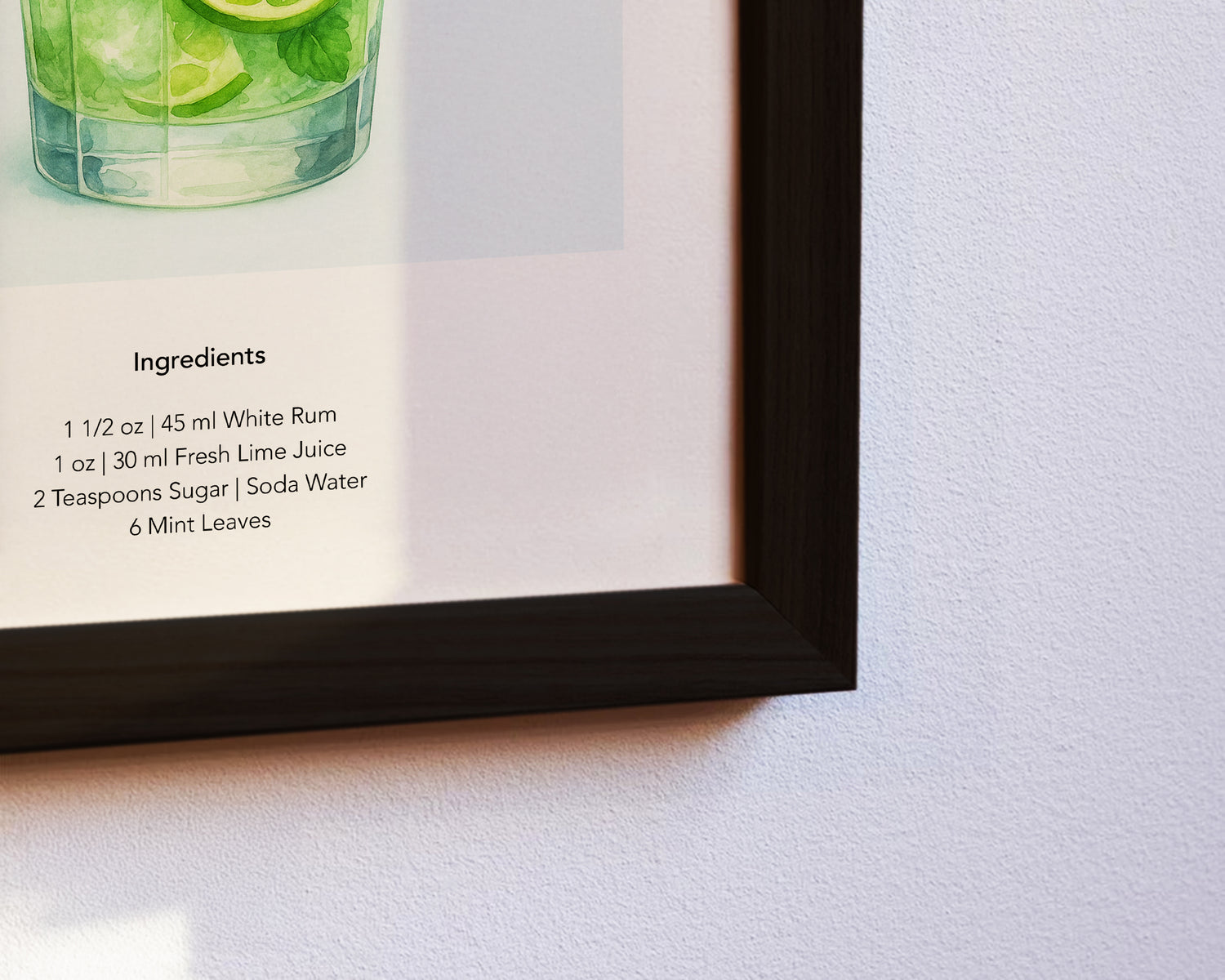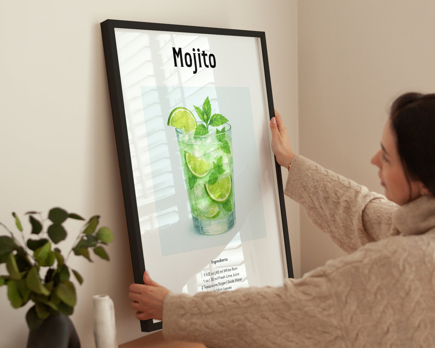 Dieses erfrischende Poster zeigt einen klassischen Mojito mit Eis, Limettenscheiben und Minzblättern im Glas – detailreich in Aquarelltechnik umgesetzt. Ideal für Cocktail-Liebhaber und als stilvolle Ergänzung für Bar, Küche oder Essbereich.