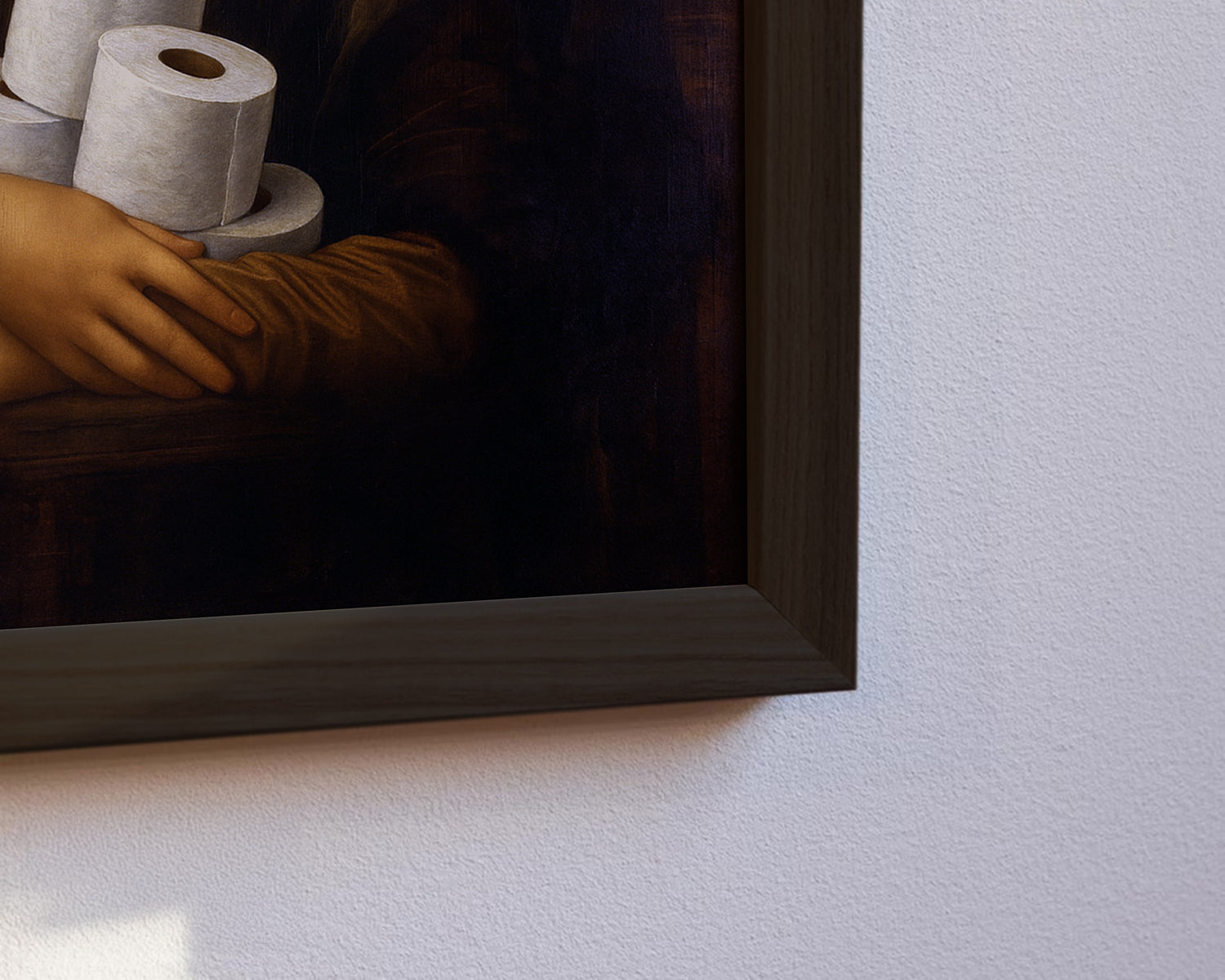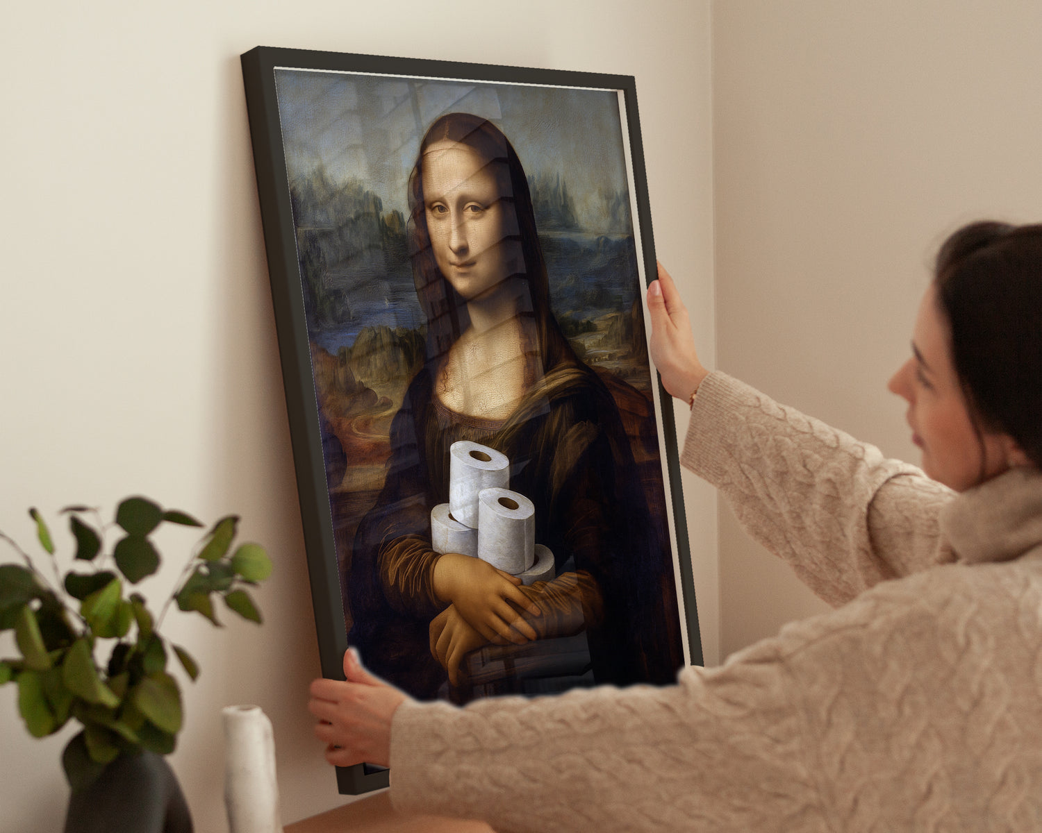 Dieses Poster verwandelt Leonardo da Vincis berühmte Mona Lisa in eine augenzwinkernde Neuinterpretation: Statt einer Handhaltung voller Geheimnisse schmiegt sie sich hier an einen Stapel schlichter Klopapierrollen. Das Motiv bleibt dem klassischen Stil und Hintergrund treu, spielt aber mit einem modernen, humorvollen Twist, der den Kunstklassiker in völlig neuem Licht erscheinen lässt. Ideal, um Badezimmer, Gäste-WC oder Wohnzimmer mit einem originellen Blickfang zu bereichern, der garantiert für Gespräche und Schmunzeln sorgt.#
