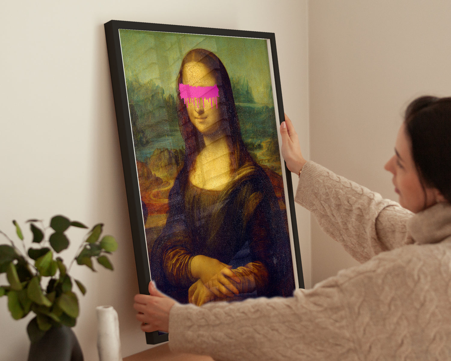 Mona Lisa auf einem Kunstdruck, deren Augen mit pinker Sprayfarbe zensiert sind. Ein spannendes Spiel aus klassischer Malerei und Street-Art.