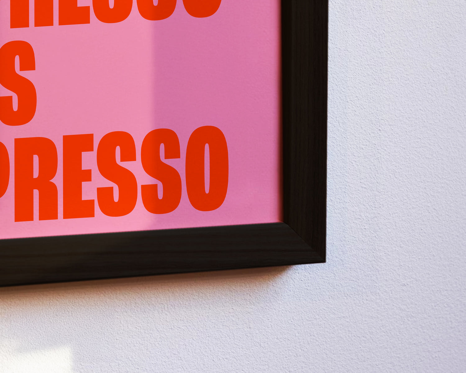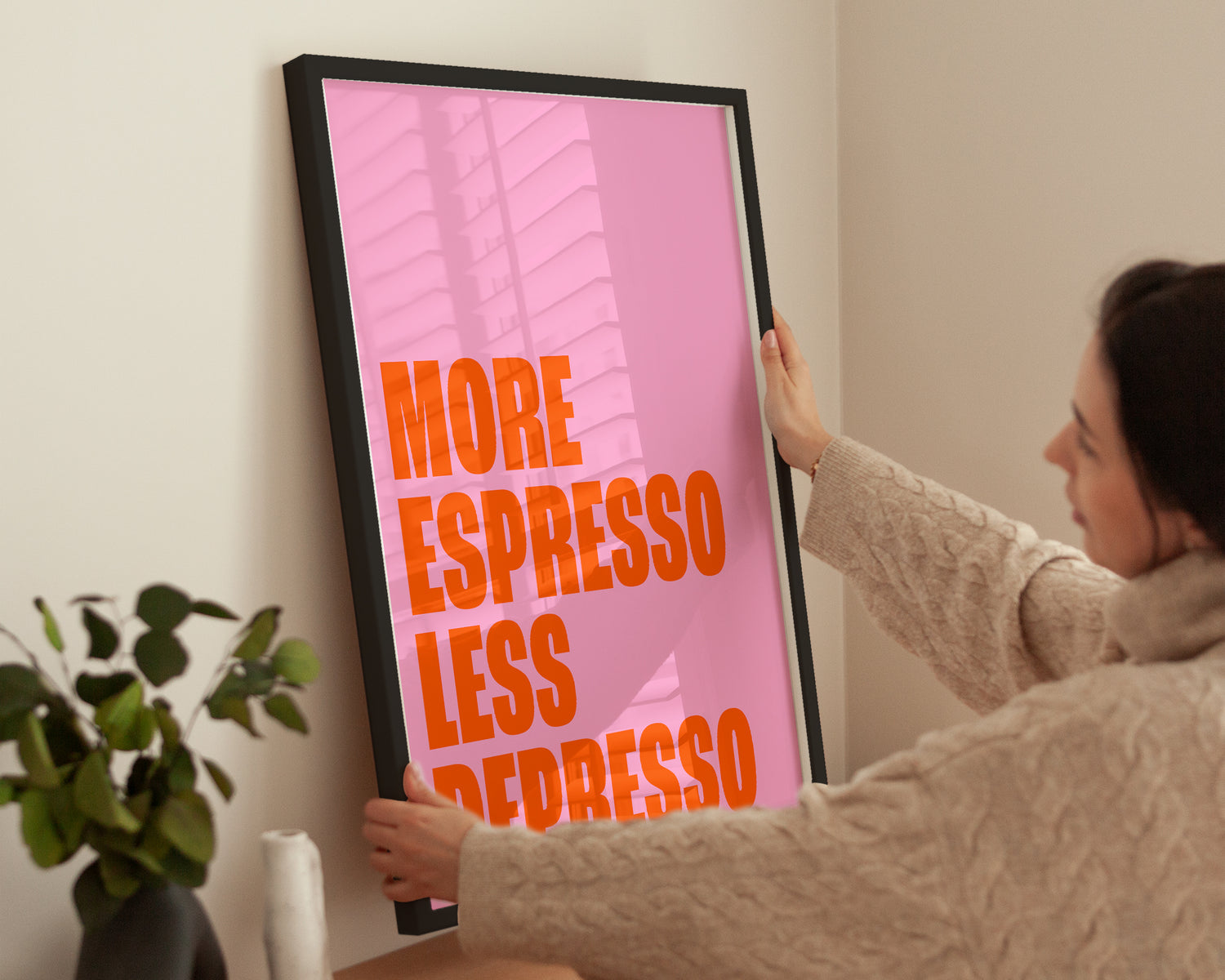 Das Poster zeigt in kraftvoller, serifenloser Schrift den humorvollen Spruch „More Espresso Less Depresso“ auf einem intensiven rosa Hintergrund. Die Kombination aus kräftigem Orange und Pink sorgt für gute Laune und lädt zu einem Lächeln ein. Ideal für kaffeeliebende Designfans, die ihre Räume mit einem frechen Statement dekorieren möchten. Das minimalistische Design passt perfekt in moderne Wohn- oder Arbeitsbereiche.