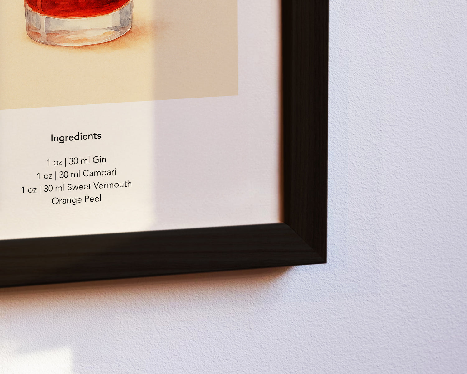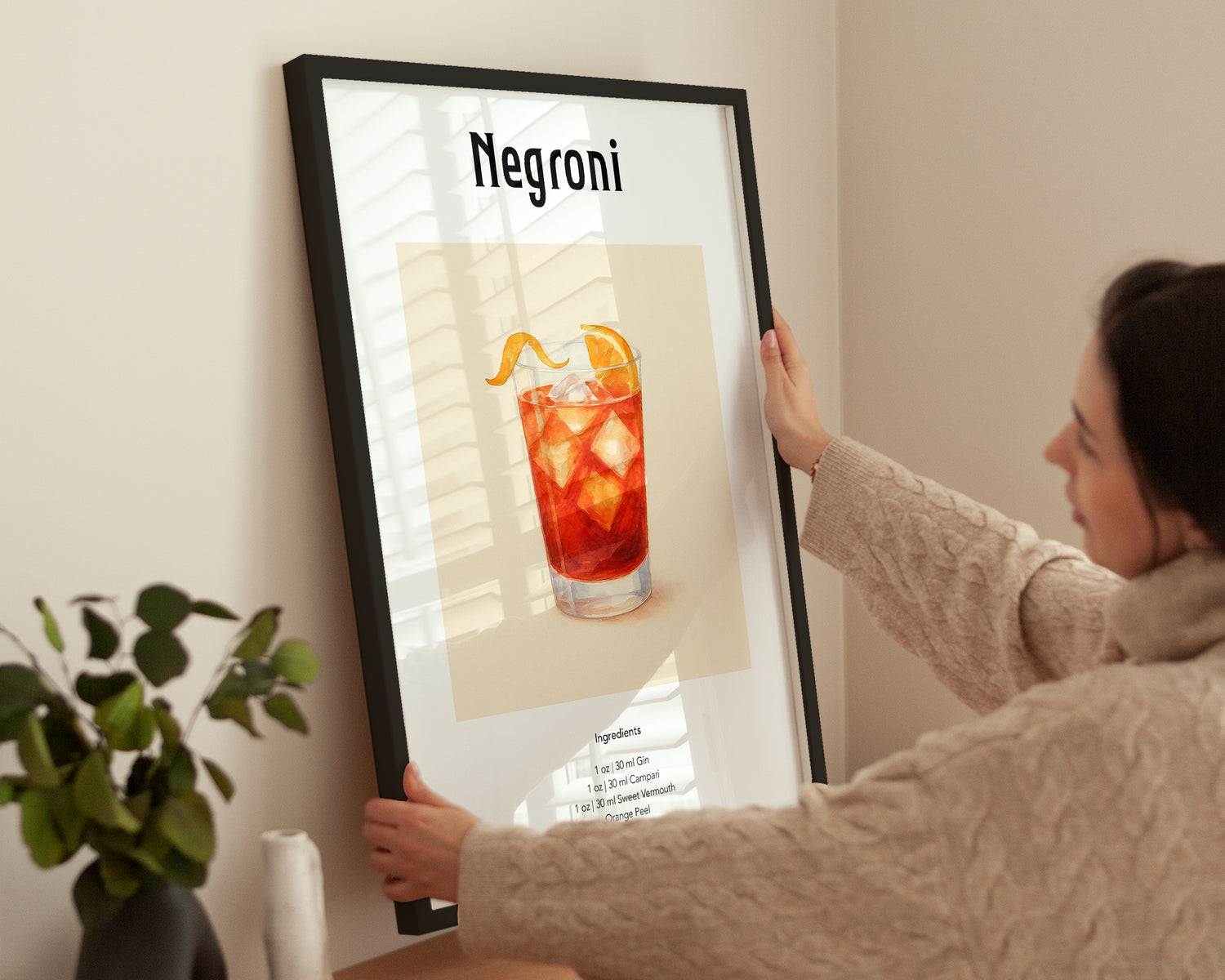 Das Negroni Poster zeigt den bitter-süßen Klassiker mit Eis und Orangenzeste in kräftigen Aquarellfarben. Diese Wandkunst bringt italienische Baratmosphäre in deine Küche oder deinen Wohnbereich – stilvoll, charaktervoll und zeitlos.