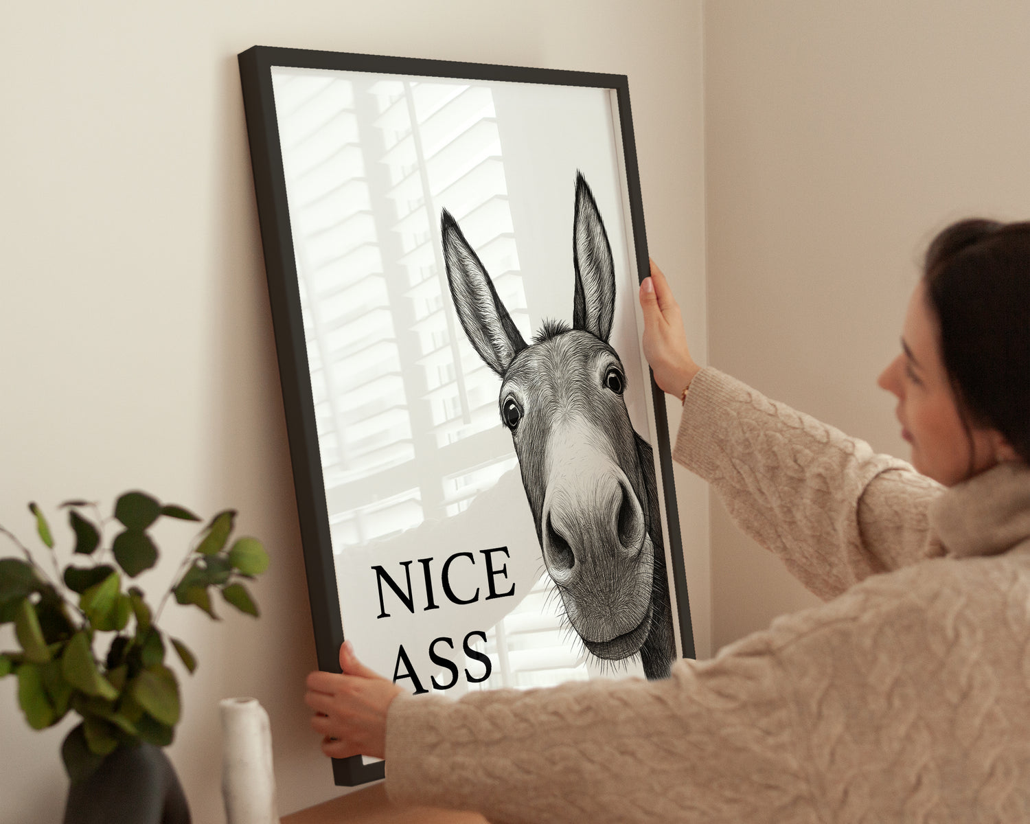 Dieses detailreiche Poster zeigt den Kopf eines neugierigen Esels mit dem Schriftzug Nice Ass und ist die perfekte humorvolle Wanddeko für Badezimmer, Gäste-WC oder Toiletten. Die feine Schwarz-Weiß Illustration wirkt hochwertig und bringt jeden Besucher zum Schmunzeln. Ideal als Geschenk oder als witziges Statement im eigenen Bad.