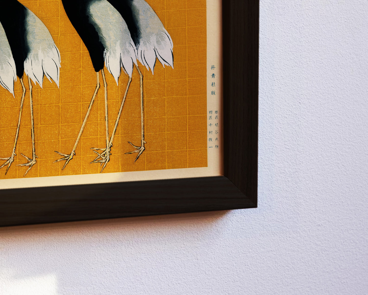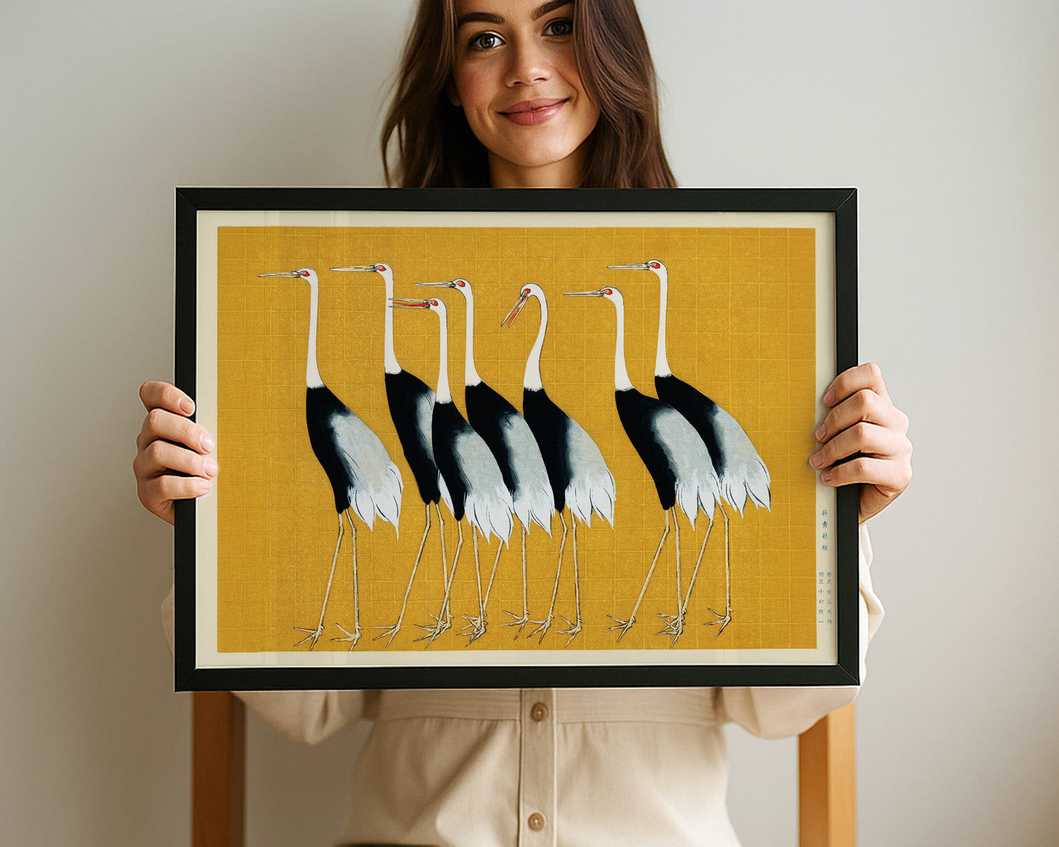 Dieses Poster zeigt das traditionelle japanische Kunstwerk von Ogata Korin mit einer Gruppe roter Kronenkraniche auf einem goldfarbenen, strukturierten Hintergrund. Die anmutigen Vögel stehen dicht beieinander und bilden eine harmonische Szene, die Ruhe und Eleganz ausstrahlt. Der feine Malstil und die dezente Farbpalette machen das Motiv zu einem edlen Hingucker in jedem Raum, ob Wohnzimmer, Schlafzimmer oder Büro.