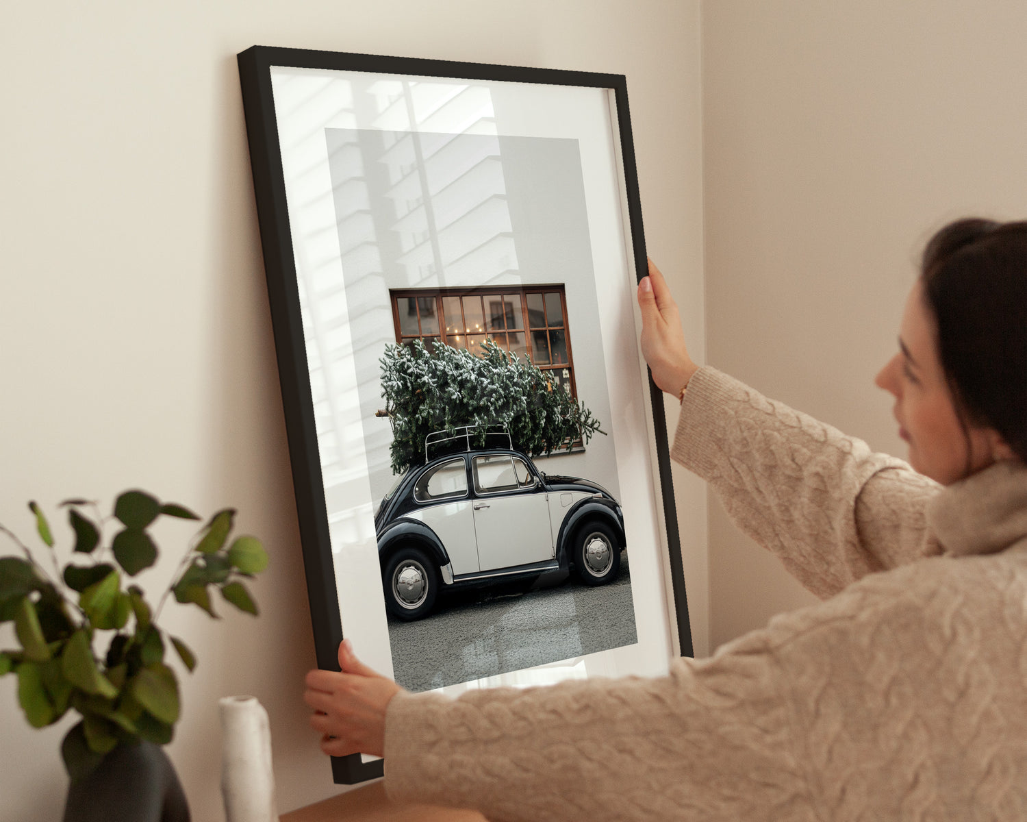 Charmantes Poster mit einem klassischen Oldtimer, auf dessen Dach ein frisch geschlagener Weihnachtsbaum transportiert wird. Das winterliche Motiv verbindet Nostalgie und Weihnachtsstimmung – perfekt für festliche Bilderwände.