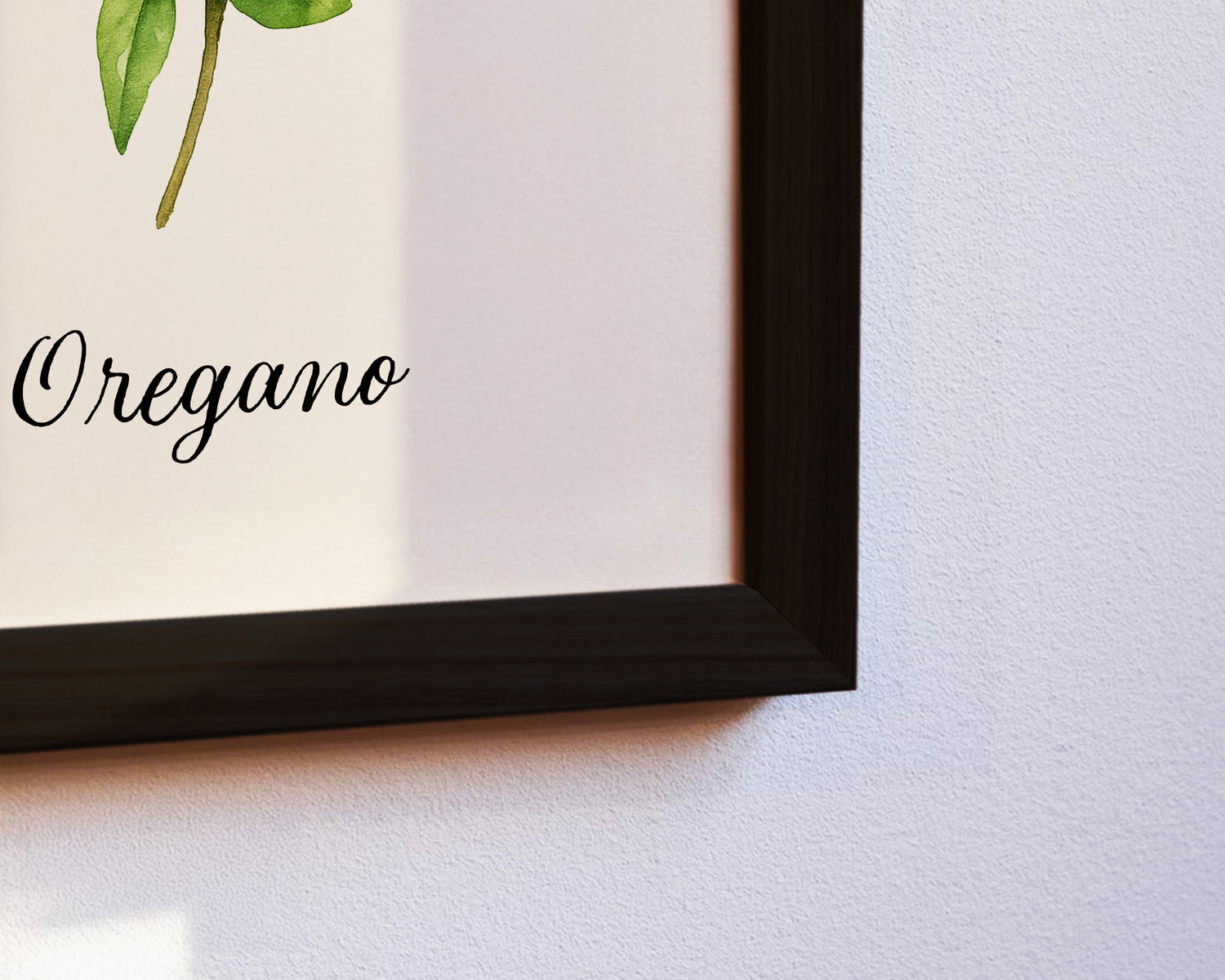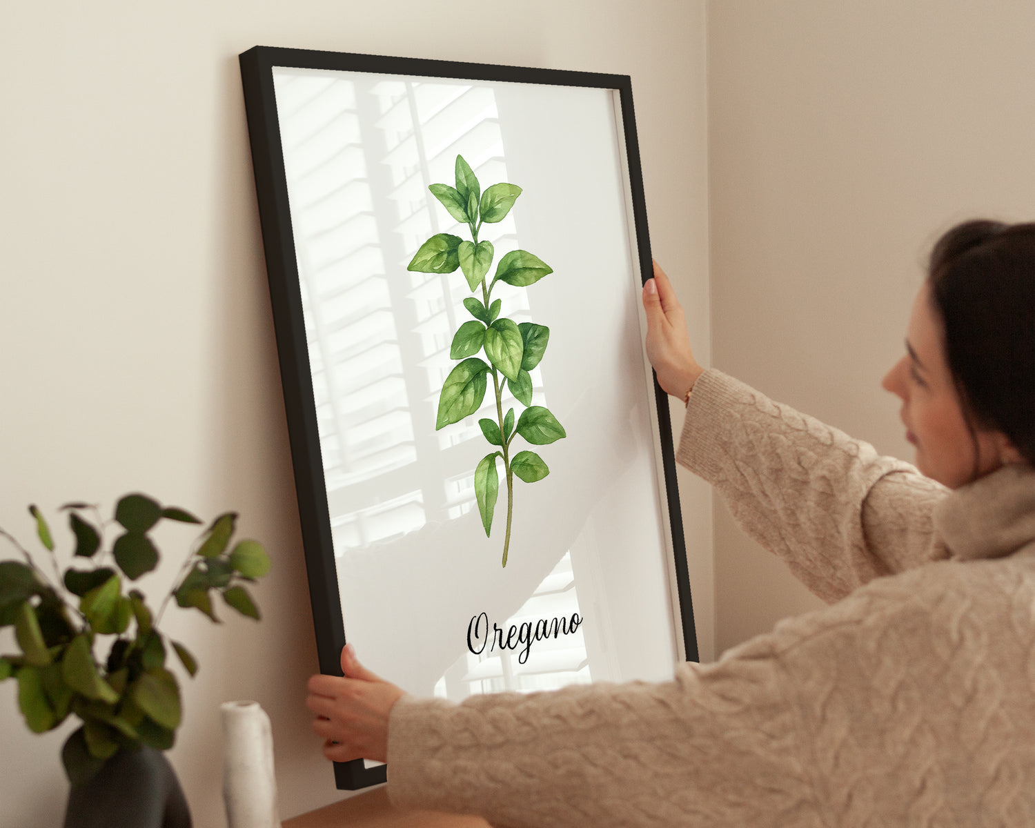 Das Poster zeigt einen filigranen Oreganostrang in realistischer Aquarelltechnik auf weißem Hintergrund. Die grünen Blätter sind in unterschiedlichen Nuancen gehalten und wirken frisch und lebendig. Perfekte Ergänzung für Küchen, Esszimmer oder Wohnzimmer. Durch den minimalistischen Stil fügt sich das Bild harmonisch in verschiedene Einrichtungsstile ein.