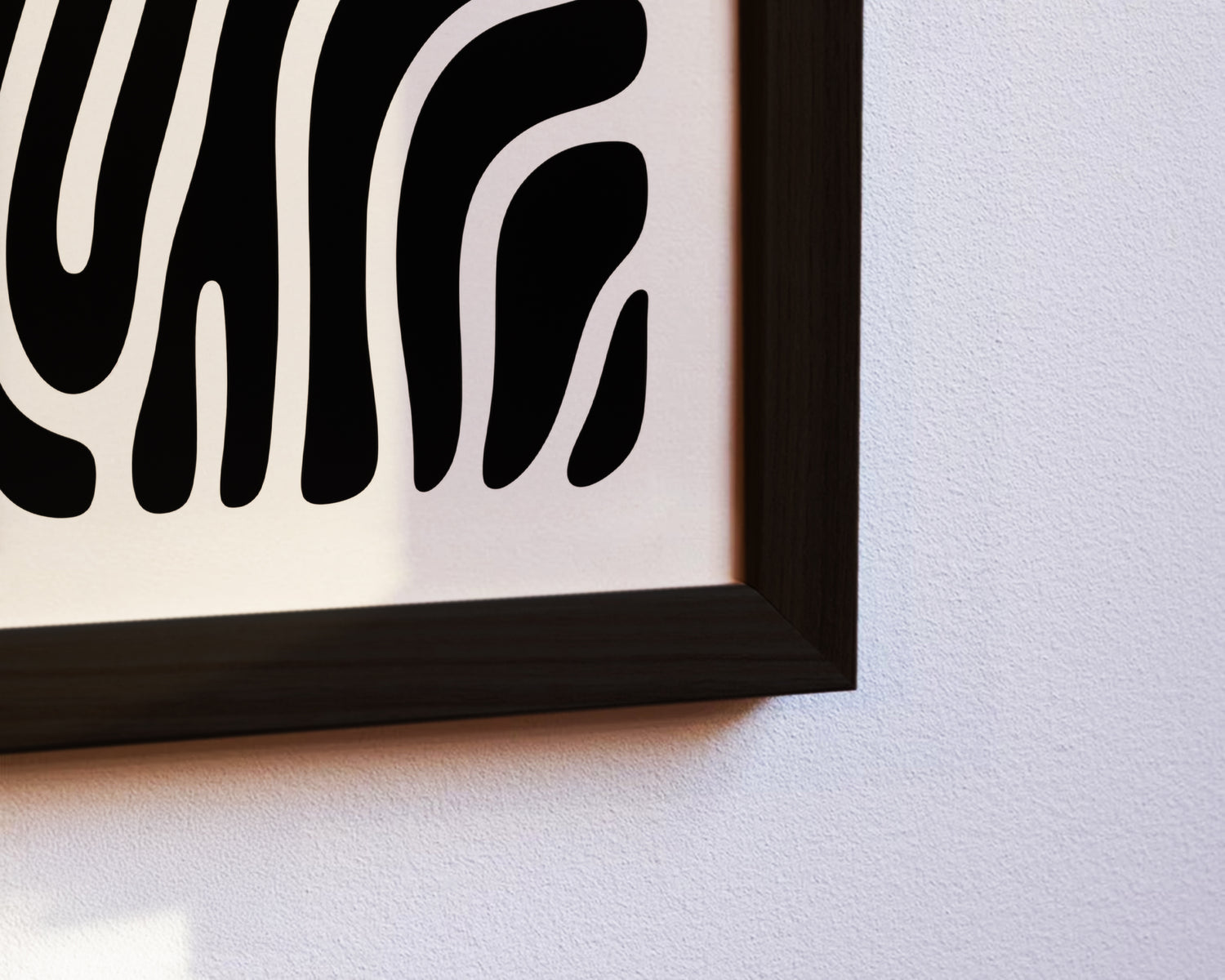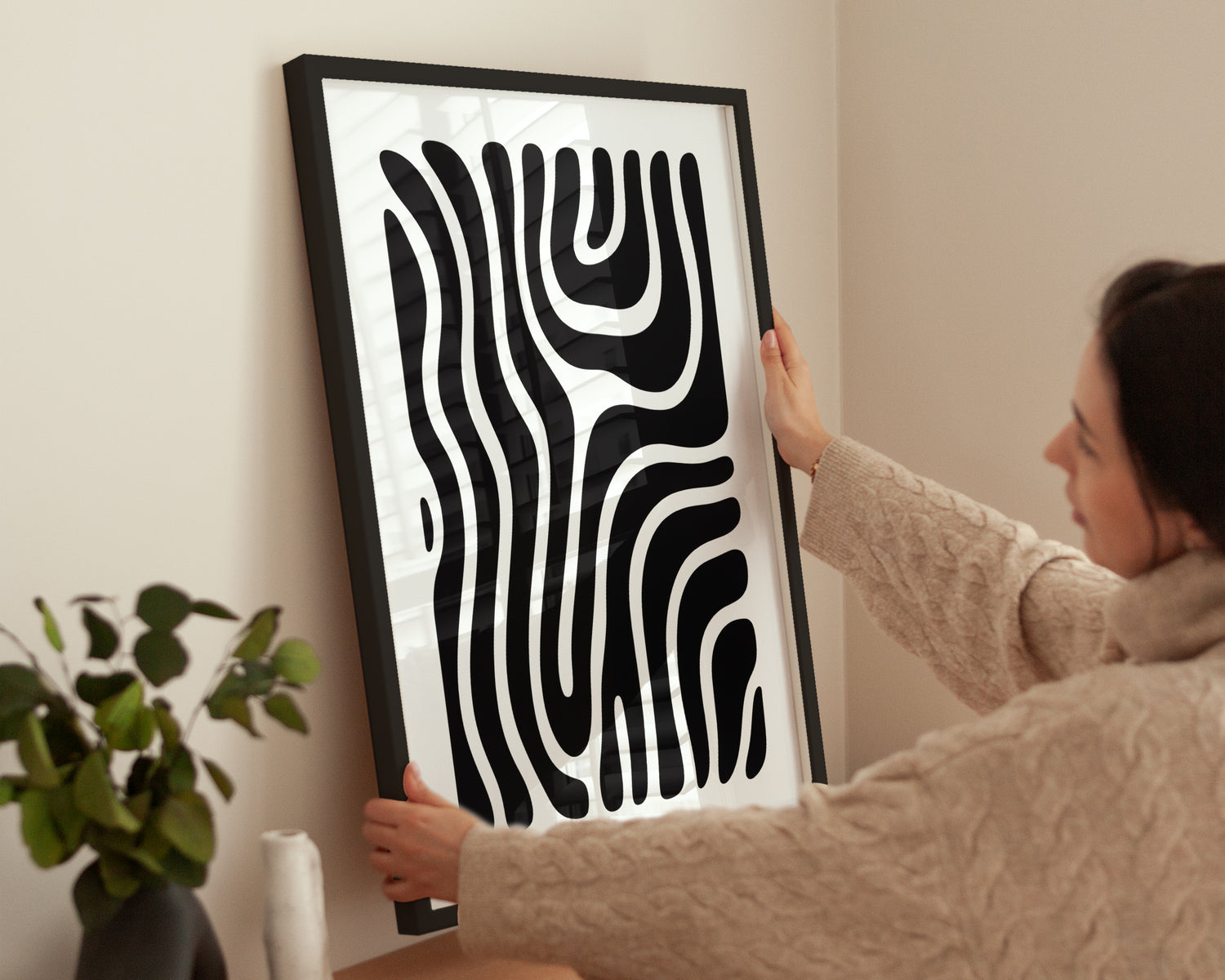 Dieses abstrakte Poster zeigt ein markantes Wellenmuster in tiefem Schwarz auf weißem Hintergrund. Die fließenden, organischen Linien erzeugen eine moderne, zeitlose Ästhetik, die zu minimalistischen, skandinavischen oder urbanen Einrichtungsstilen passt. Klare Kontraste bringen Dynamik in den Raum, während das Muster eine natürliche Leichtigkeit bewahrt. Gedruckt auf mattem Premium-Papier kommt die Tiefe des Schwarz besonders zur Geltung – ein stilvoller Blickfang für Wohnzimmer, Schlafzimmer oder Büro.