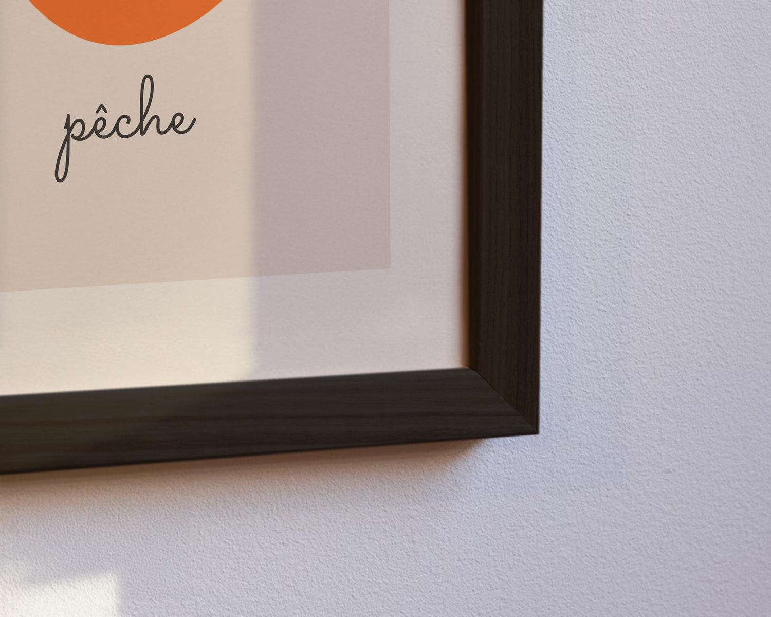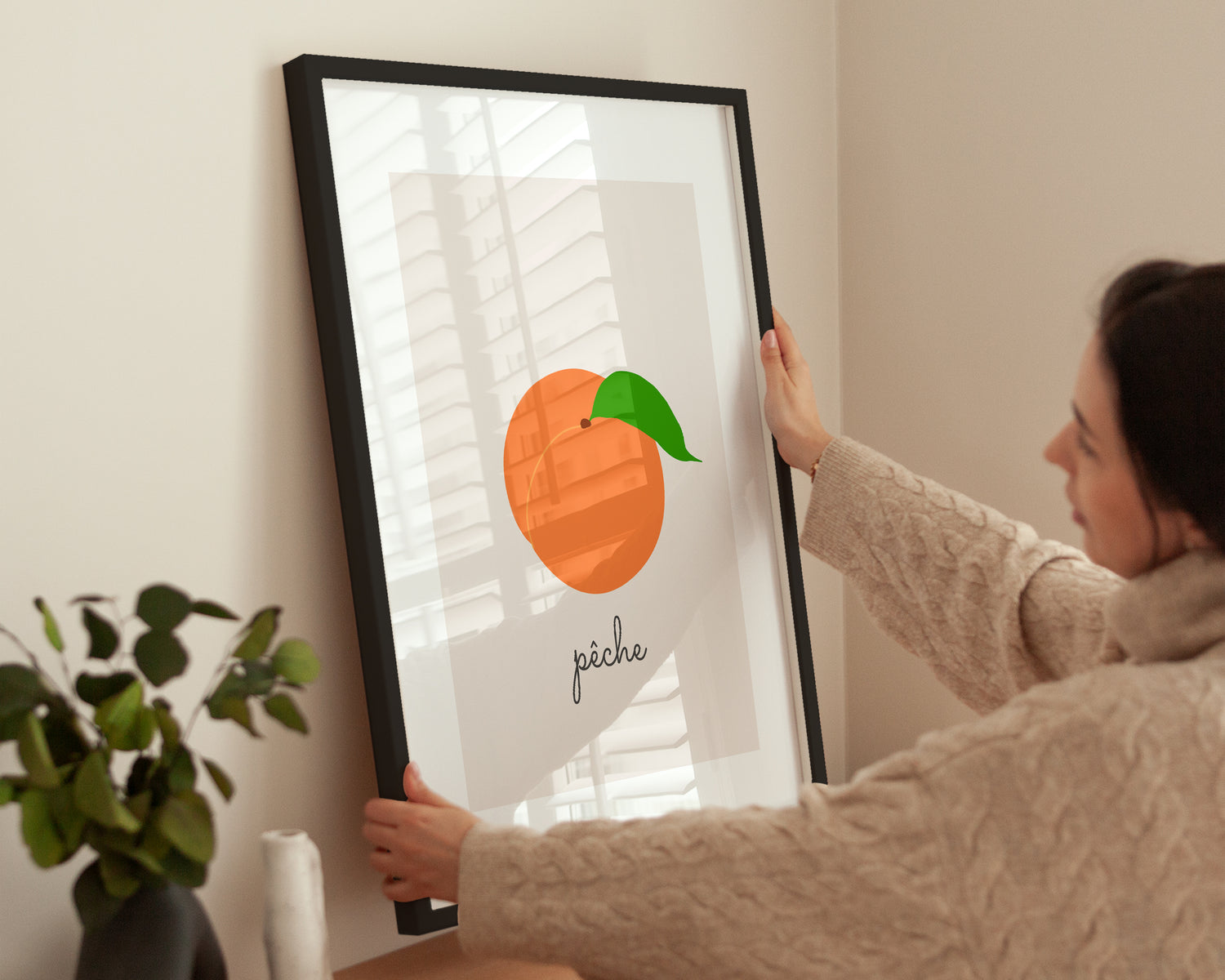 Helles Poster mit einer minimalistischen Zeichnung eines Pfirsichs und dem Schriftzug „peche“. Ein modernes, charmantes Küchenbild.