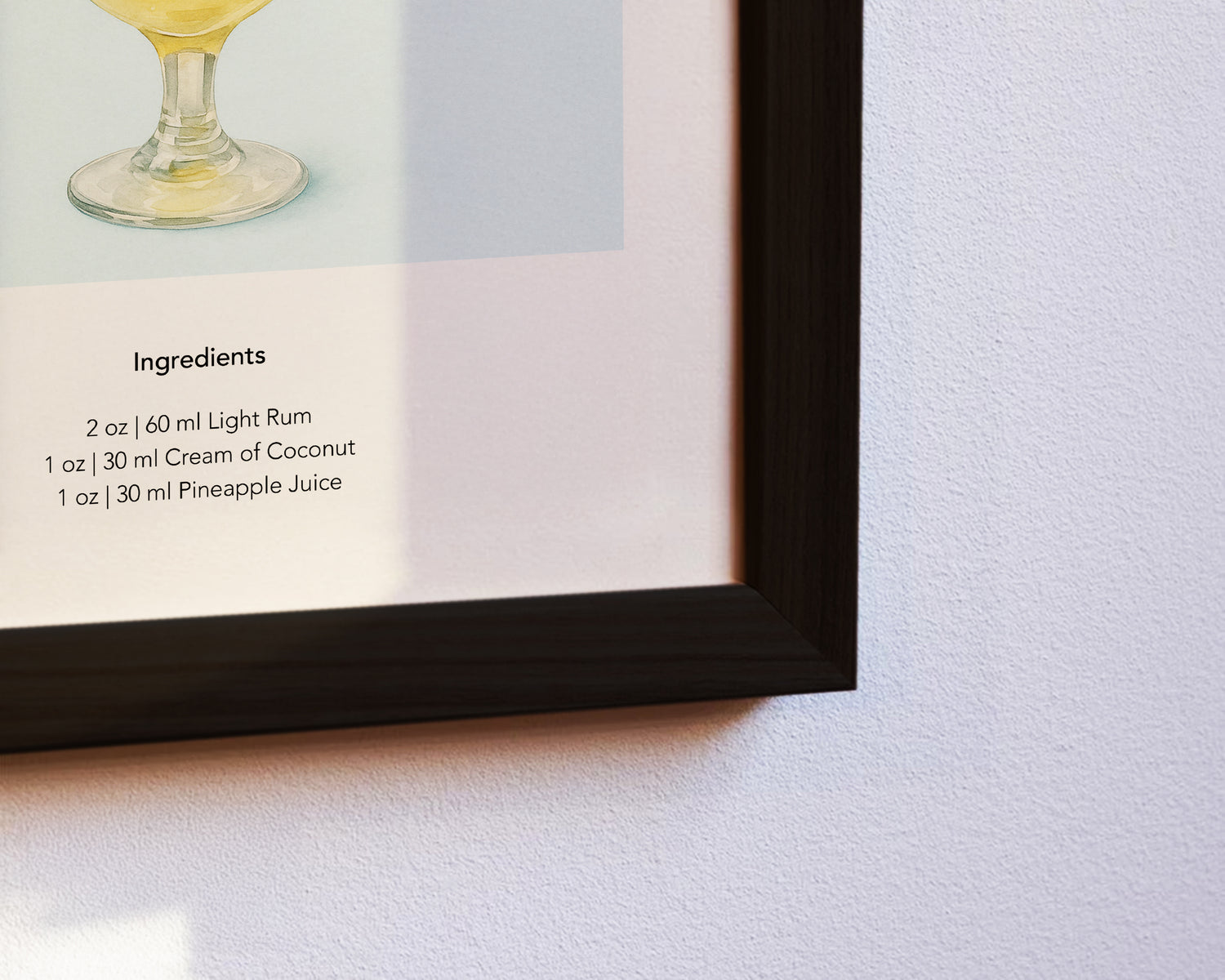 Dieses Poster bringt karibisches Urlaubsgefühl an deine Wand. Der cremige Piña Colada im Glas, garniert mit Ananasscheibe und Kirsche, ist kunstvoll in Aquarelltechnik umgesetzt – perfekt für Sommerbars, Küchen und tropische Interieurs.