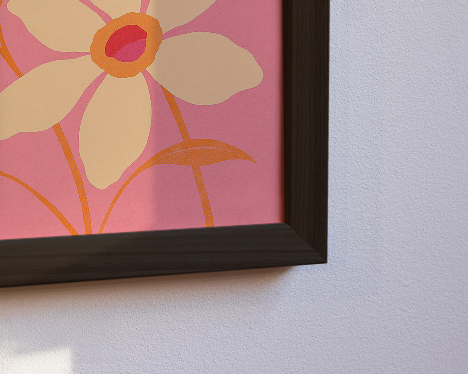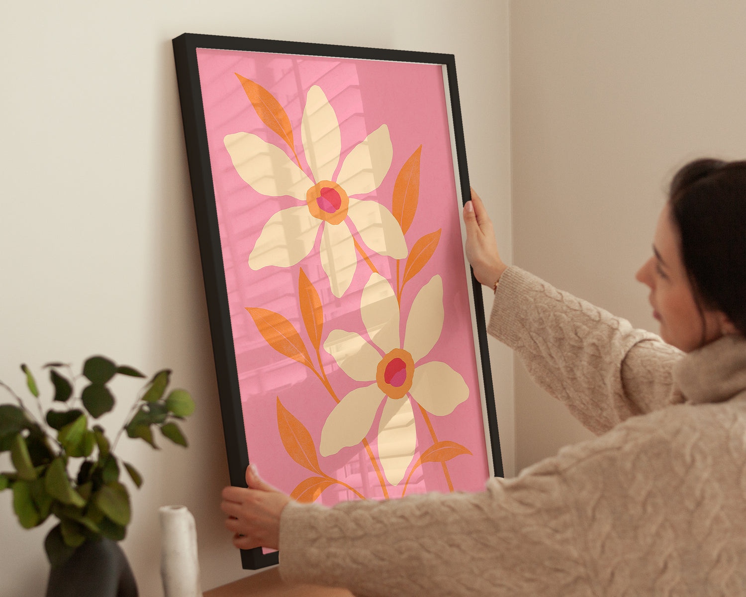 Dieses moderne Poster zeigt zwei große stilisierte Blumen in sanftem Cremeweiß mit orangefarbenen Blättern und Stielen, die sich vor einem kräftig pinkfarbenen Hintergrund abheben. Das minimalistische Design setzt auf klare Formen und lebendige Farbtöne, die Fröhlichkeit und Wärme ausstrahlen. Ein Hingucker, der sowohl in modernen Wohnräumen als auch in gemütlichen Bereichen seine Wirkung entfaltet und mit seiner frischen, floralen Ästhetik ein Gefühl von Leichtigkeit verbreitet.