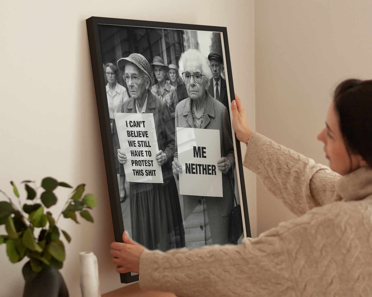 Dieses Schwarz-Weiß-Poster zeigt zwei ältere Damen mit ernsten Blicken, die an einer Demonstration teilnehmen. Die Frau links hält ein Schild mit dem Text „I can’t believe we still have to protest this shit“, während die Frau rechts ein Schild mit „Me neither“ präsentiert. Die Aufnahme ist im dokumentarischen Stil gehalten und bringt durch den Kontrast zwischen dem Alter der Frauen und ihrer klaren Botschaft ein humorvoll-ironisches, zugleich aber auch tiefgründiges gesellschaftliches Statement an deine Wand.