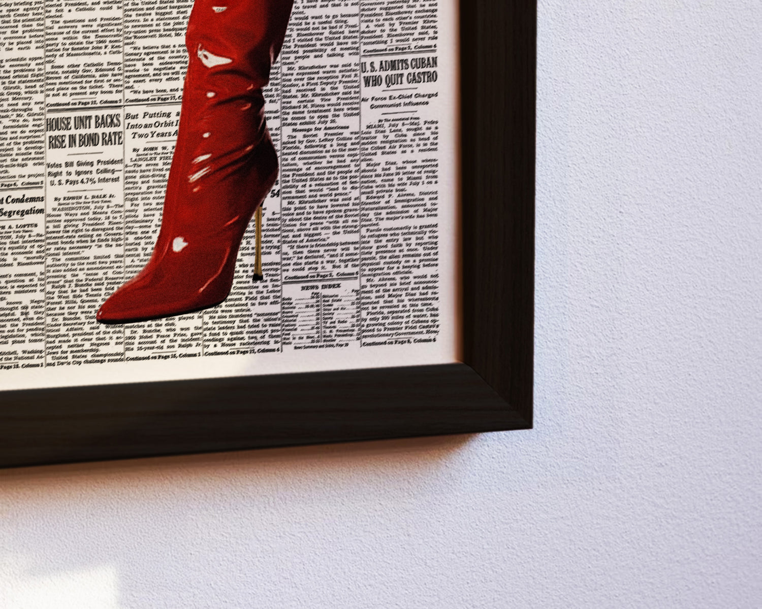 Schwarz-weißes Zeitungs-Poster mit auffälligem Farbdetail: glänzende rote High Heels. Ein ausdrucksstarkes Wandbild, das Glamour und Modebewusstsein vereint. Ideal für Schlafzimmer, Ankleidezimmer oder als Fashion-Statement im Wohnzimmer.