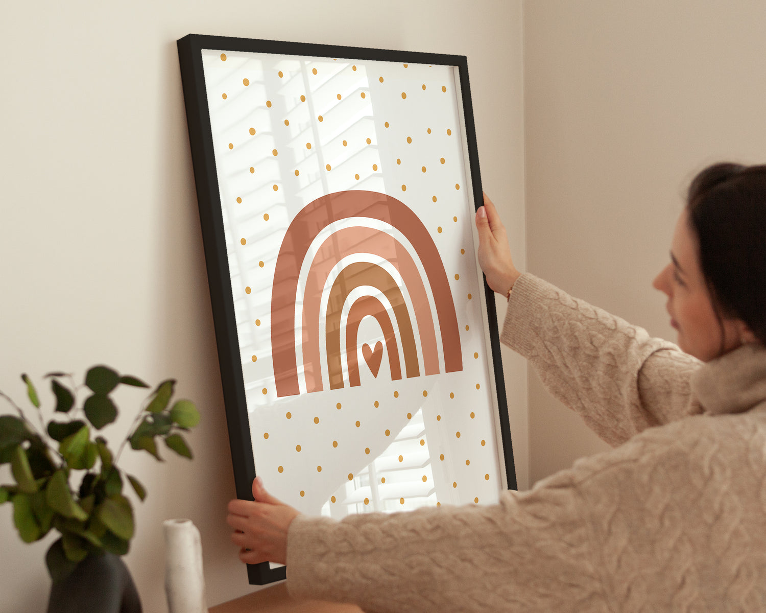Das Poster Regenbogenherz begeistert mit einer sanften Farbpalette in Erdtönen und einem Herz im Zentrum. Perfekt für das moderne Kinderzimmer – verspielt und dekorativ zugleich.