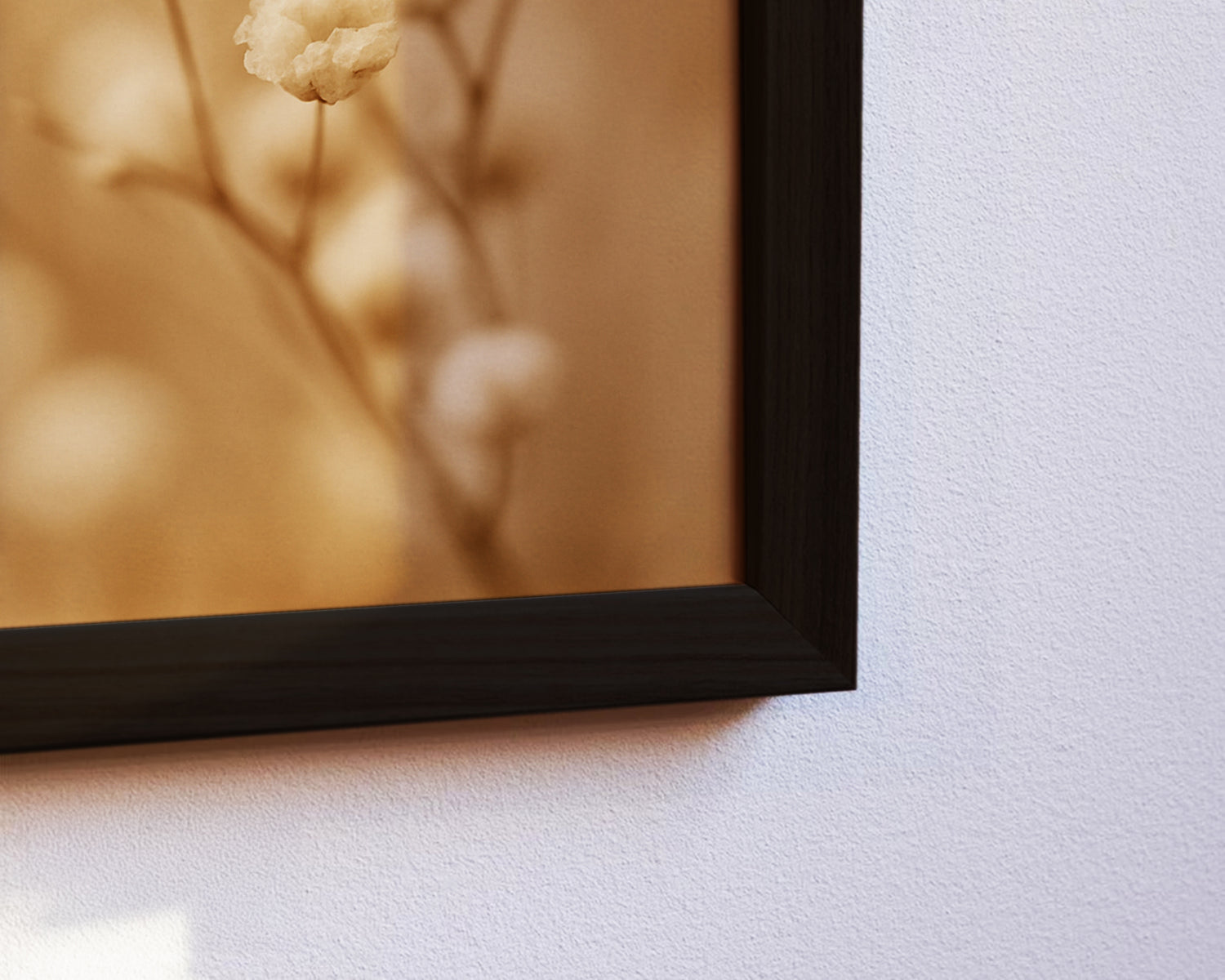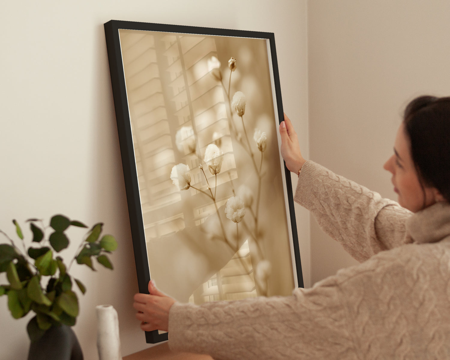 Dieses Motiv bringt die Leichtigkeit floraler Eleganz an deine Wand und sorgt mit zarten Blüten in natürlichem Sepia für eine ruhige, stilvolle Wohnatmosphäre