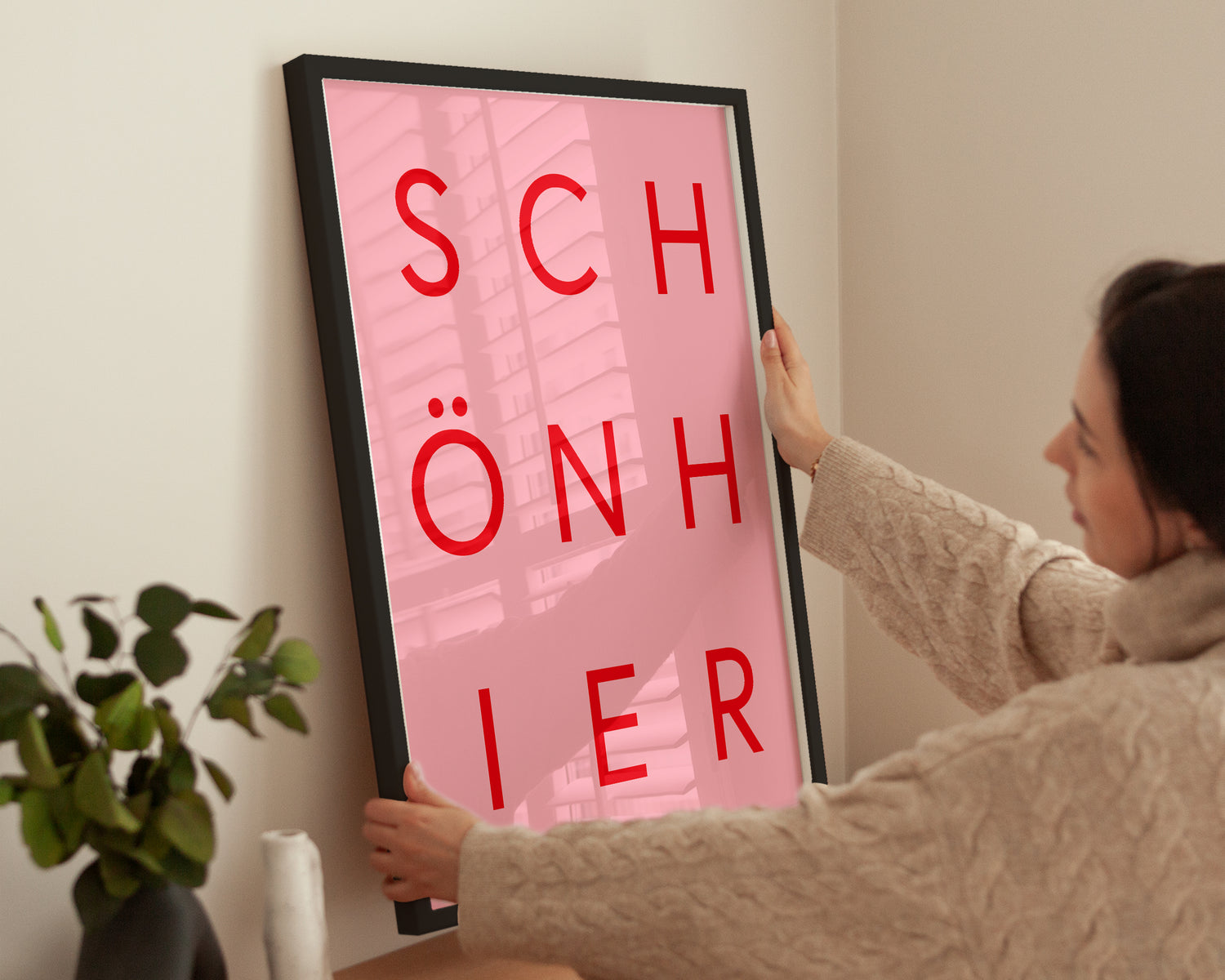 Modernes Typografieposter mit dem Schriftzug „SCHÖN HIER“ in kräftigem Rot auf sanftem Rosa. Klare, serifenlose Schrift und kontrastreiche Farbgebung verleihen dem Motiv eine frische, zeitgenössische Ausstrahlung. Ideal als fröhlicher Akzent für Wohnzimmer, Küche oder Arbeitszimmer. Hochwertiger Druck auf mattem Premium-Papier sorgt für brillante Farbwirkung und gestochen scharfe Typografie. Dieses Statement-Piece bringt sofort gute Laune und verleiht jedem Raum einen modernen, einladenden Charakter.