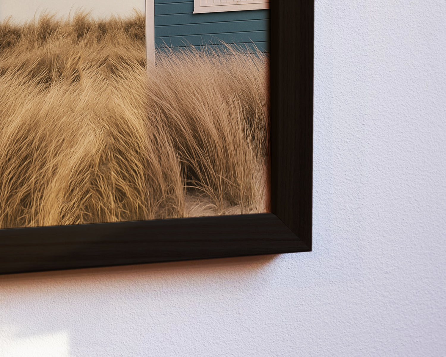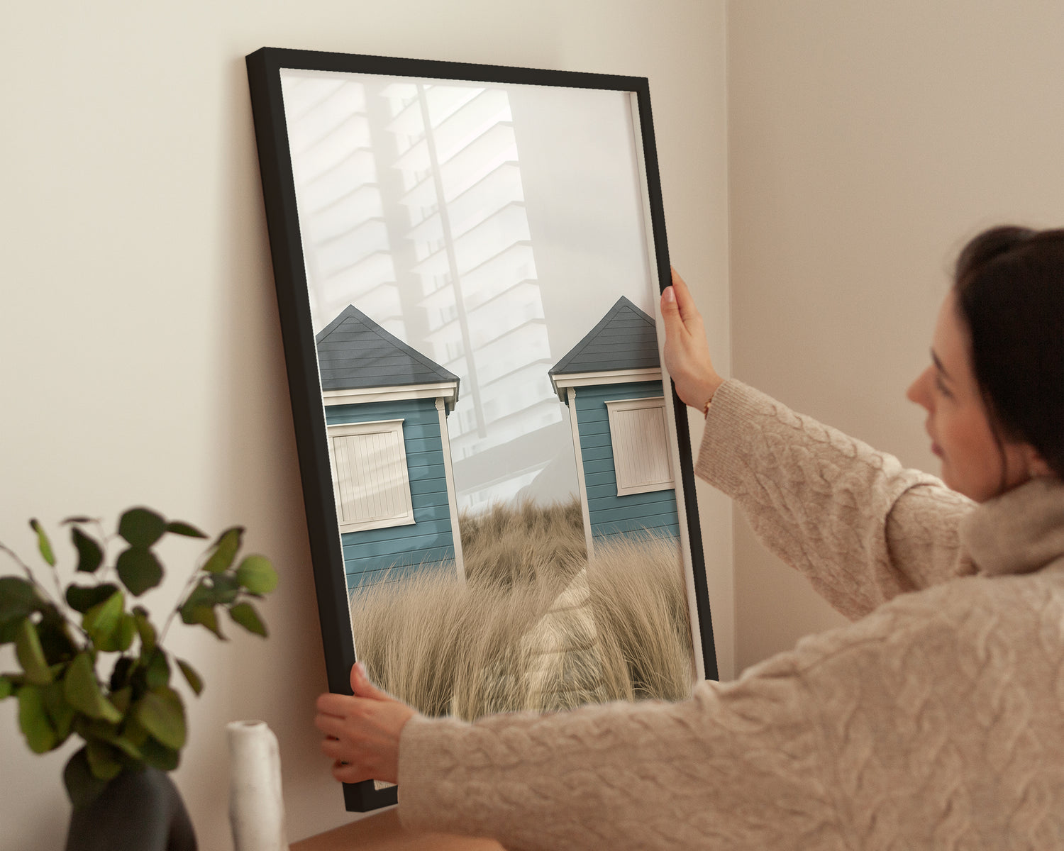 Die blauen Häuschen vor hellem Himmel und inmitten von Strandgras wirken beruhigend und stilvoll. Dieses Poster bringt maritimes Flair und architektonische Klarheit in dein Zuhause.