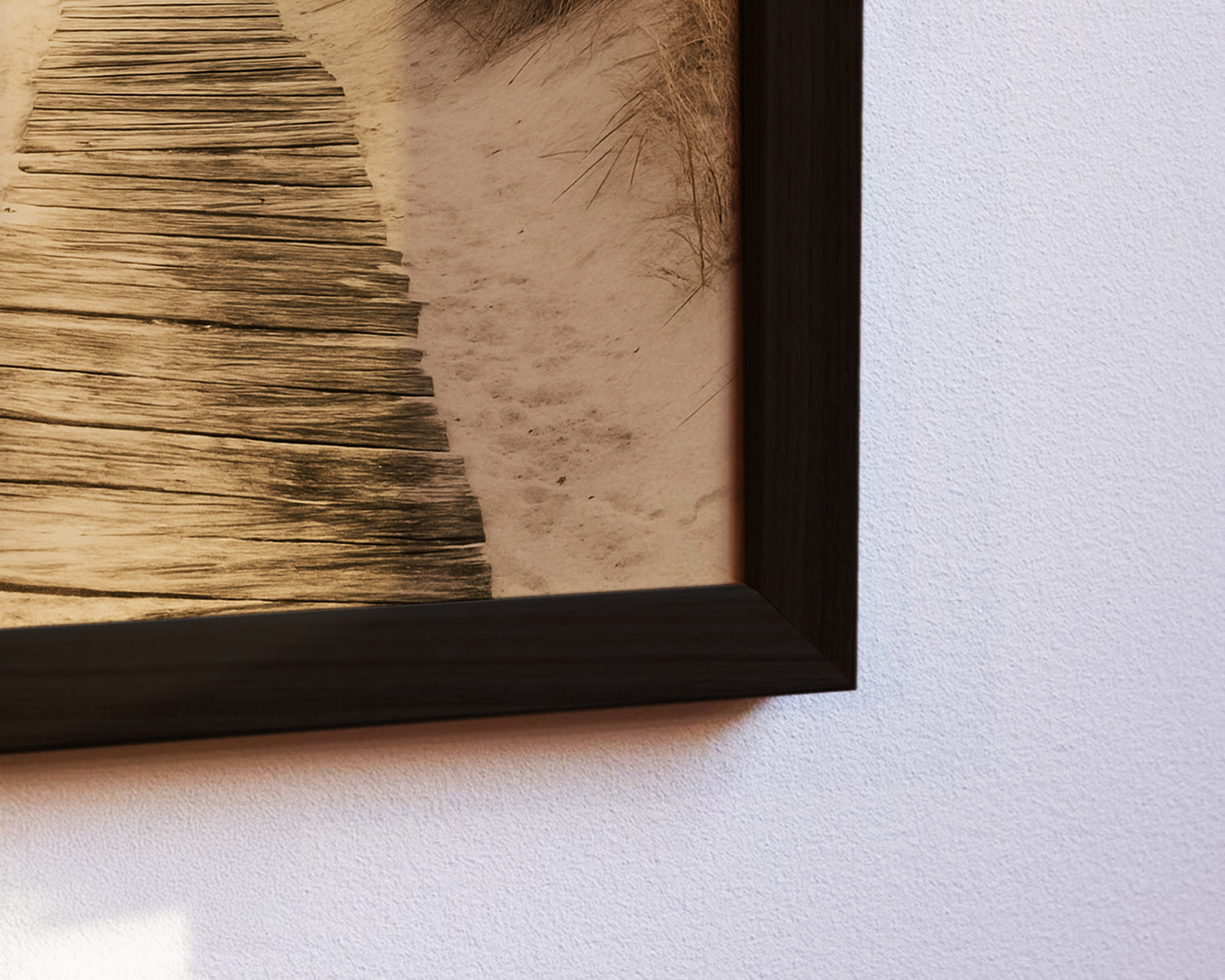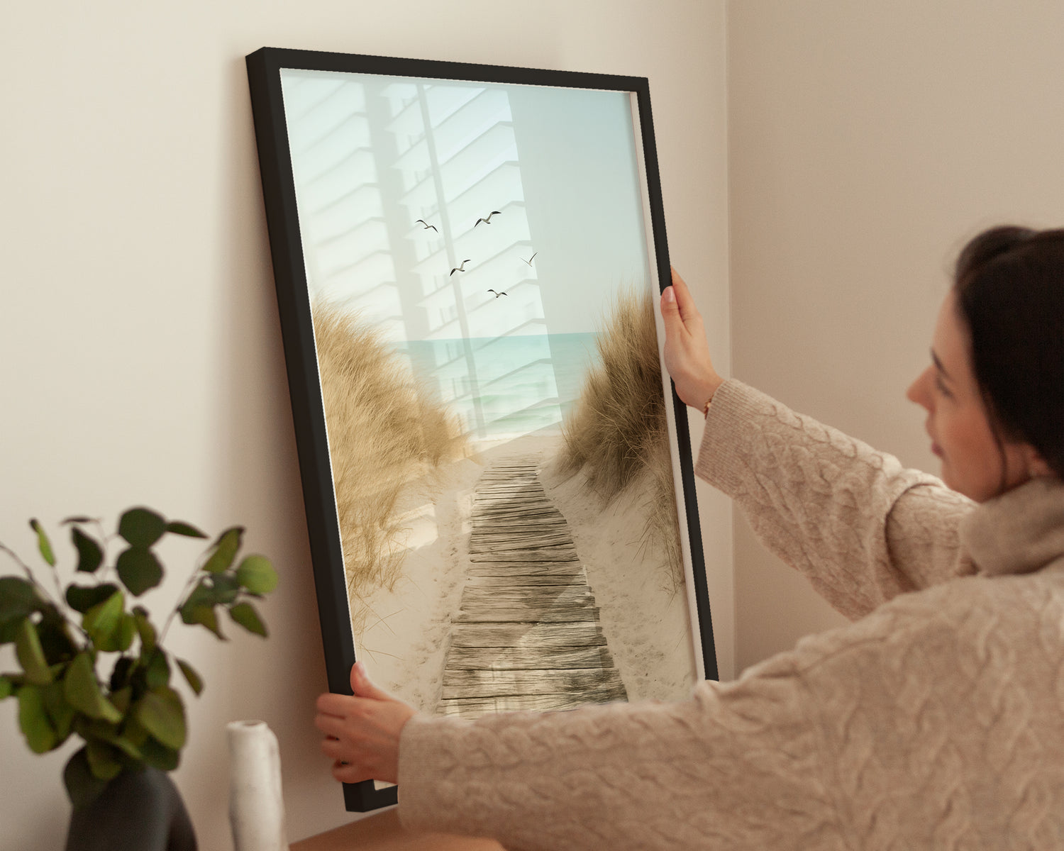 Dieses Poster zeigt einen verwitterten Holzweg durch Dünen mit Blick auf das ruhige Meer. Es schafft eine friedliche, maritime Atmosphäre und bringt Urlaubsstimmung in jeden Raum.