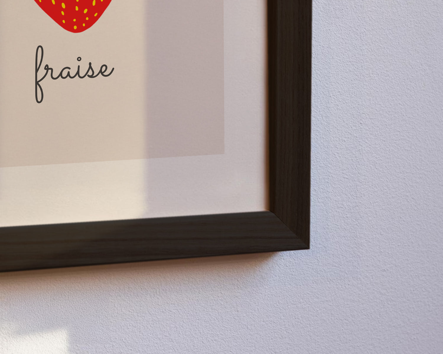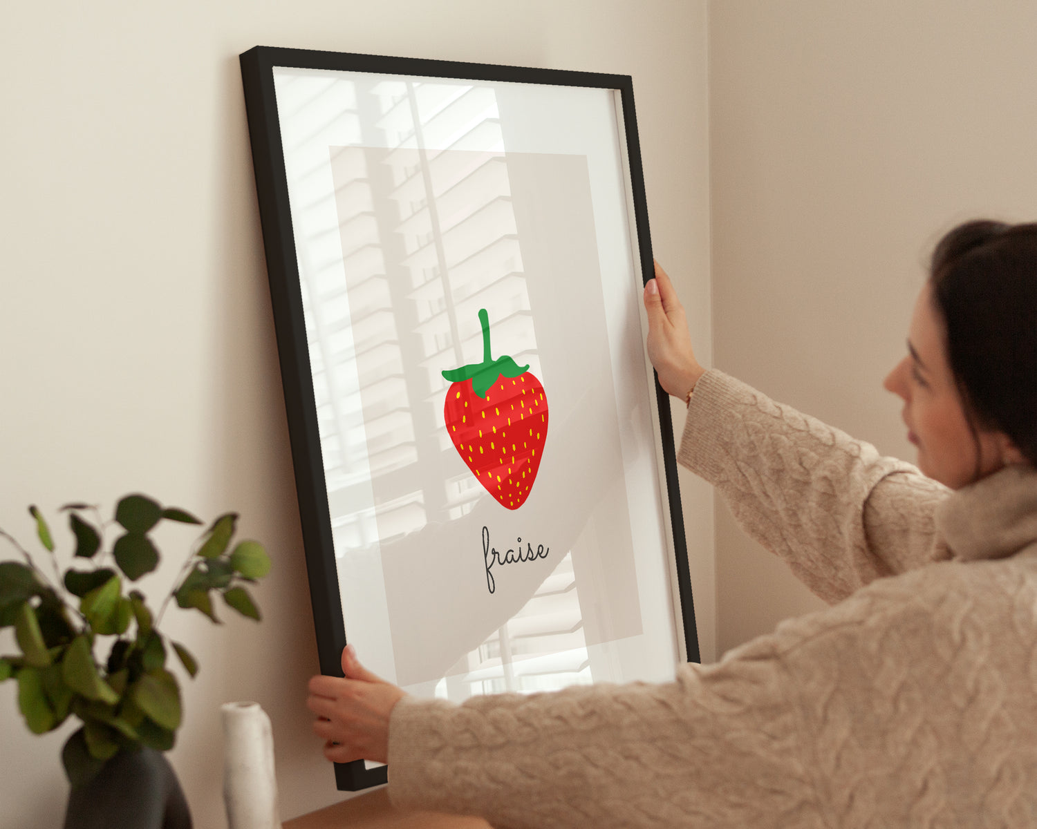 Illustration einer roten Erdbeere mit dem Schriftzug „fraise“. Ein minimalistisches, verspieltes Poster für eine lebendige Küchenatmosphäre.