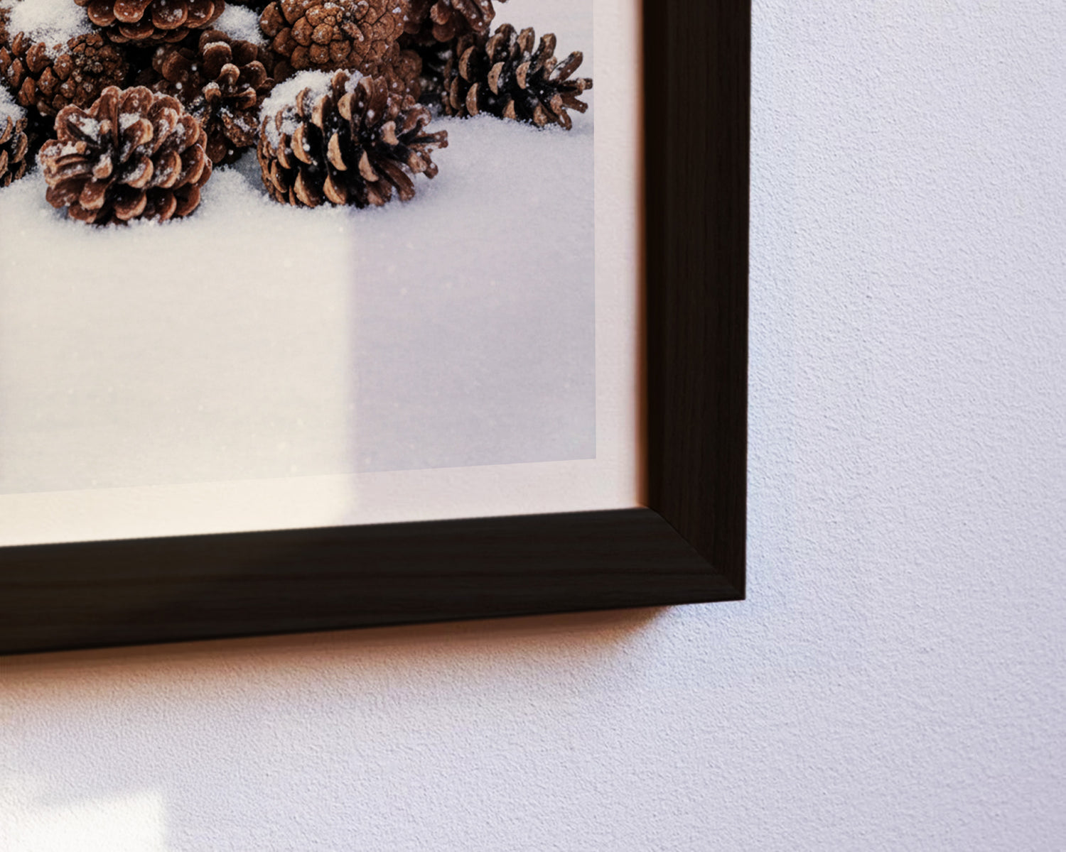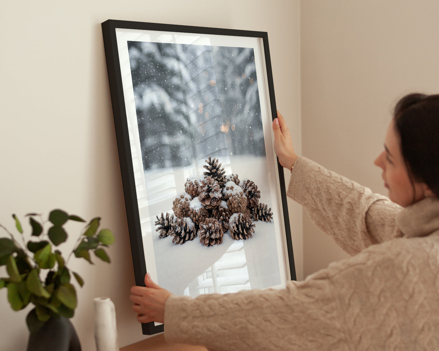 Ein Poster mit detailreichen Tannenzapfen, die von frischem Schnee bedeckt sind. Das minimalistische Naturmotiv bringt winterliche Ruhe und Natürlichkeit in deine Wohnräume. Ideal als Kombination mit anderen Weihnachts- und Naturpostern.