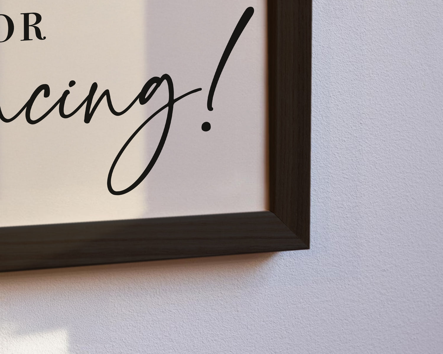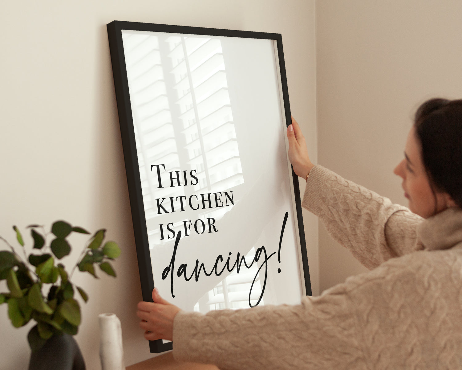 Schwarz-weißes Typografie-Poster mit dem Spruch „This Kitchen Is For Dancing“. Perfekt für Küchen, die zum Tanzen und Genießen einladen.