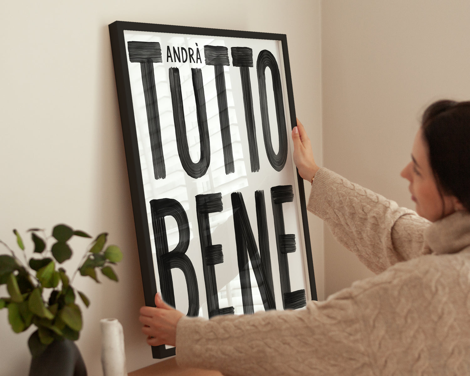 Dieses moderne Poster zeigt den italienischen Motivationsspruch „Tutto Andrà Bene“ in klarer schwarzer Typografie auf weißem Hintergrund. Es verbreitet Optimismus und eignet sich hervorragend als stilvolle Wanddekoration in Wohnzimmern, Büros oder Fluren. Das minimalistische Design fügt sich nahtlos in verschiedene Einrichtungsstile ein und bringt eine positive Botschaft in dein Zuhause.
