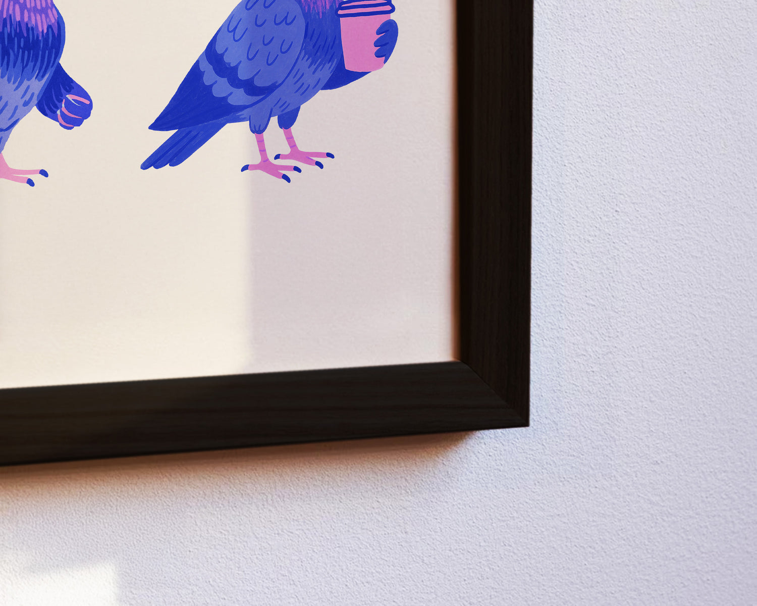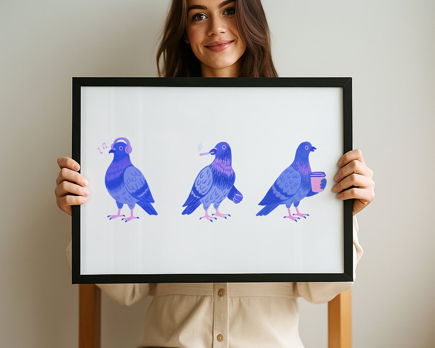 Dieses humorvolle Poster zeigt drei stilisierte urbane Tauben: eine trägt Kopfhörer, eine raucht eine Zigarette und die dritte hält einen Kaffeebecher. Die Illustration in Blau- und Violetttönen bringt moderne Tierkunst und urbanen Charme in dein Zuhause. Perfekt geeignet für Wohnzimmer, Küche oder Büro, setzt es einen witzigen Akzent an jeder Wand.