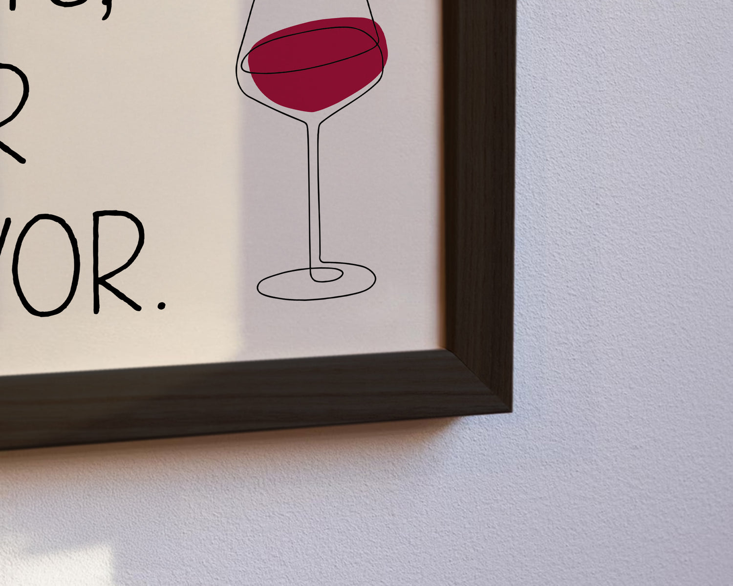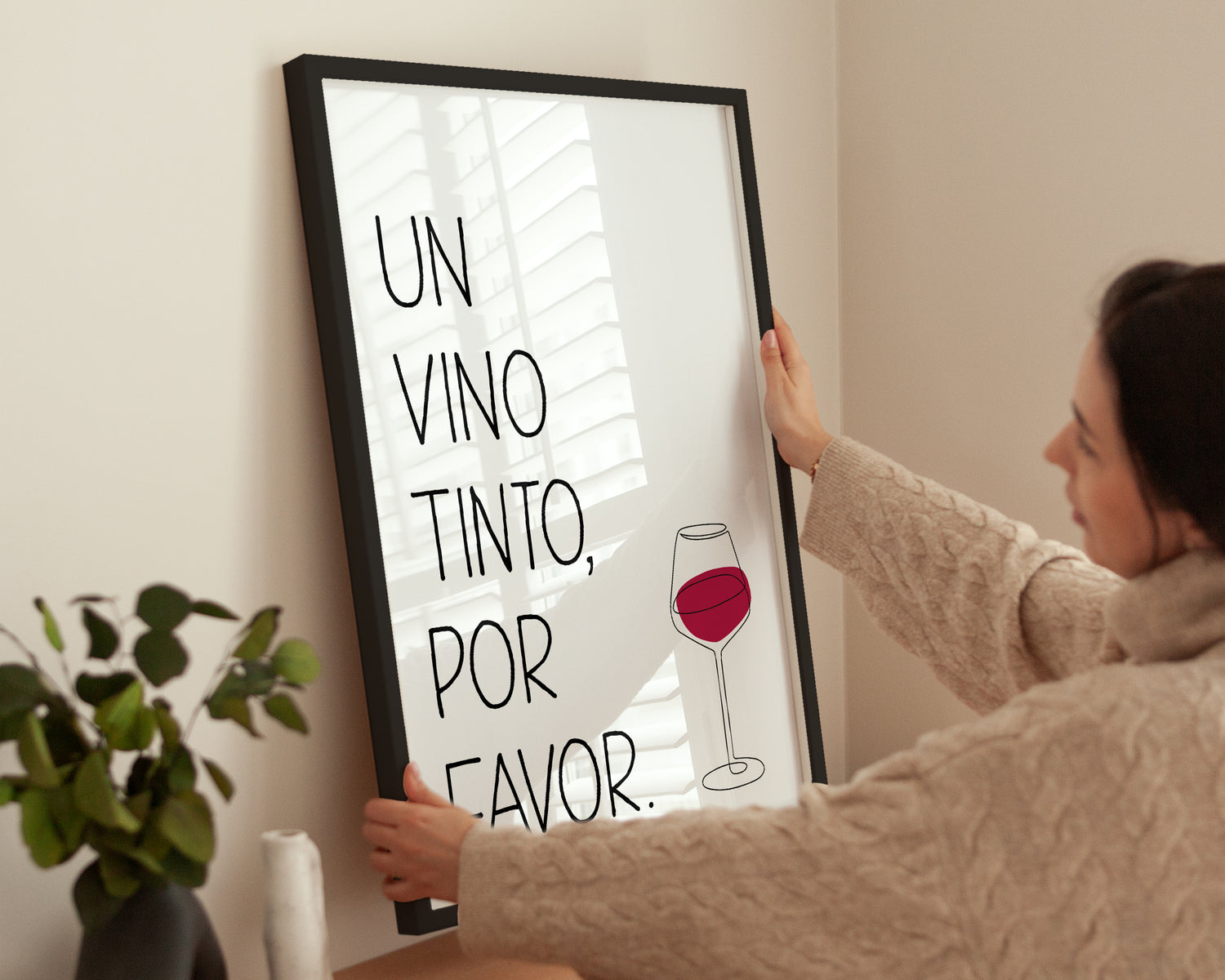 Weißes Poster mit elegantem Text „Un Vino Tinto Por Favor“ und gezeichnetem Glas Rotwein. Perfekt für Weinliebhaber und moderne Küchen.