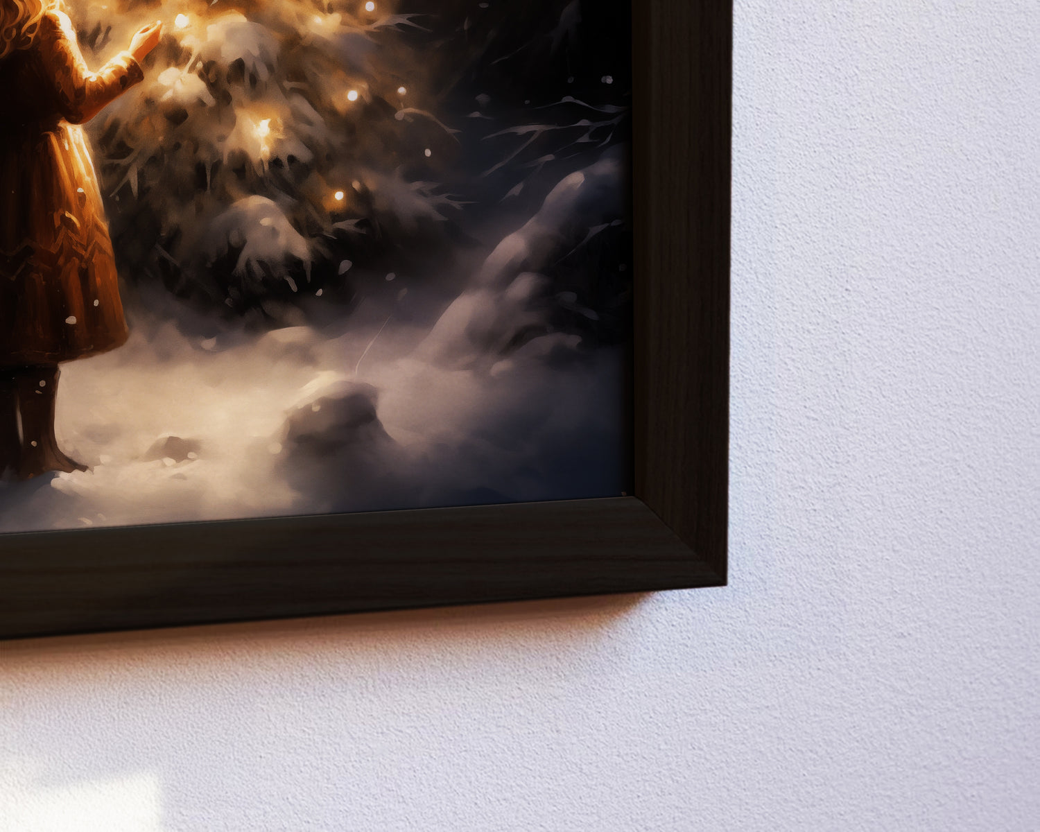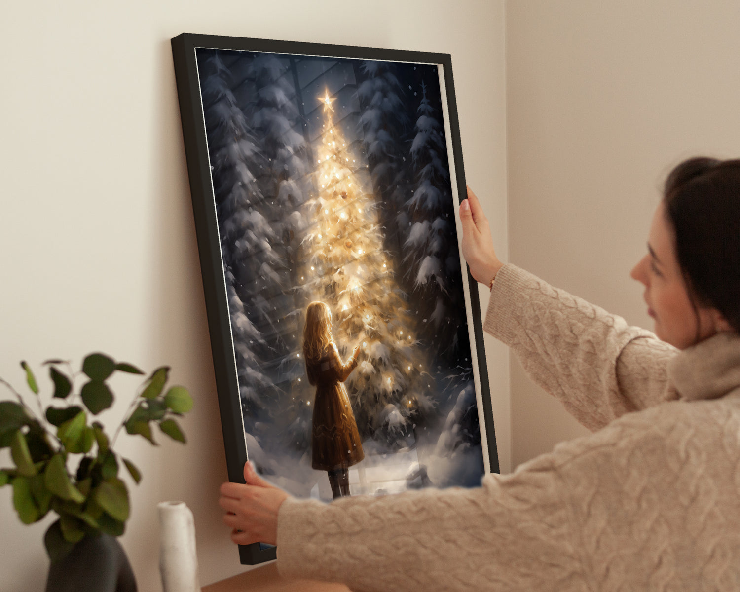 Dieses stimmungsvolle Poster zeigt einen gold leuchtenden Weihnachtsbaum inmitten eines verschneiten Waldes. Eine Frau steht davor und betrachtet das warme Licht, das Ruhe, Magie und Festlichkeit ausstrahlt. Ideal für Wohnzimmer, Schlafzimmer oder als weihnachtlicher Akzent im Flur. Gedruckt auf mattem Premium-Papier bringt es sanfte Lichtreflexe und winterliche Atmosphäre perfekt zur Geltung, schafft Gemütlichkeit und wird zum festlichen Highlight in jedem Raum.