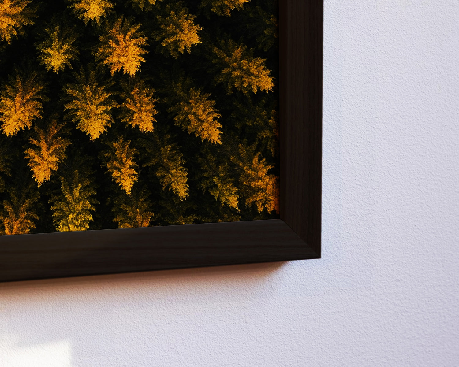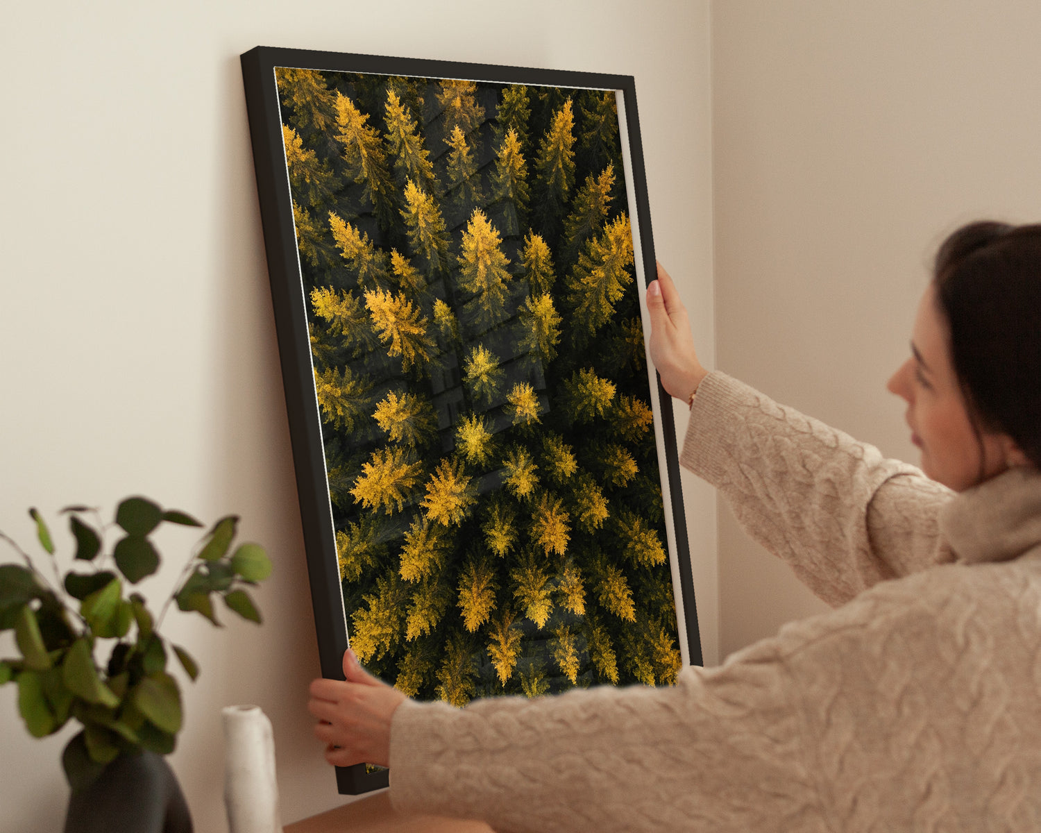 Ein beeindruckendes Poster mit einer Luftaufnahme von dichten Baumkronen in sattem Grün und leuchtendem Herbstgelb. Das minimalistische Naturmotiv bringt Tiefe und Ruhe in moderne Wohnräume.