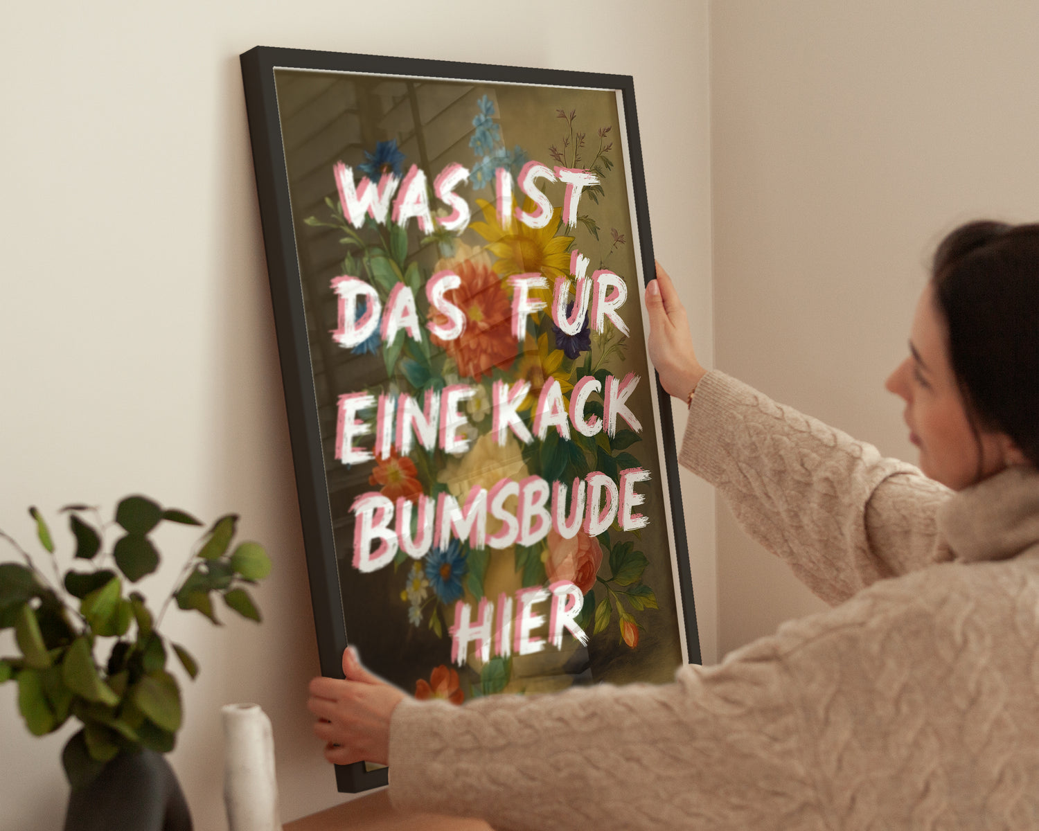 Dieses Poster bringt augenzwinkernden Humor an deine Wand: Auf einem detailreichen, klassischen Blumenstrauß prangt in kräftiger, leicht verwischter Pinselschrift der Spruch „Was ist das für eine Kack Bumsbude hier“. Die Kombination aus traditionellem Floralmotiv und rotziger Typografie macht dieses Bild zu einem echten Gesprächsstück, ideal für Gäste-WCs, Wohnzimmer, Büros oder als kreatives Geschenk für Freunde mit Sinn für Sarkasmus.
