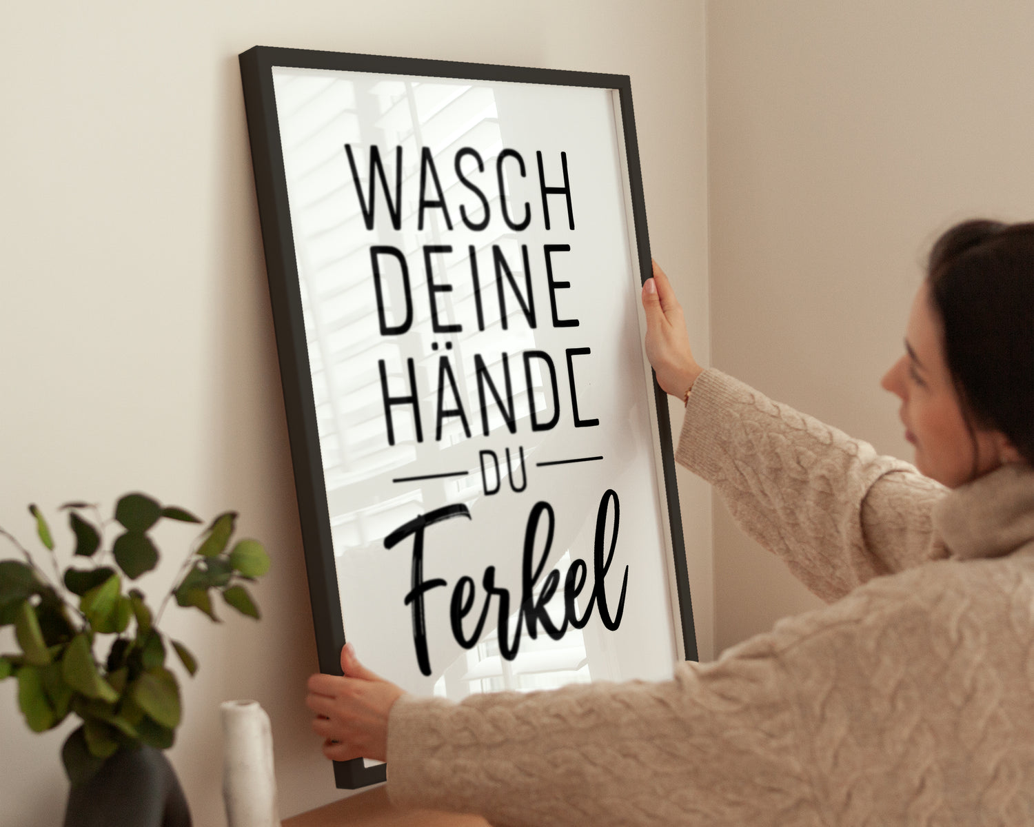 Dieses witzige Typografie Poster mit dem Spruch Wasch deine Hände du Ferkel bringt Humor und Leichtigkeit ins Badezimmer oder Gäste-WC. Die schlichte schwarz-weiße Gestaltung passt in jedes moderne Zuhause und erinnert charmant daran, sich die Hände zu waschen. Ideal als Geschenk oder zum eigenen Aufhängen im Bad.