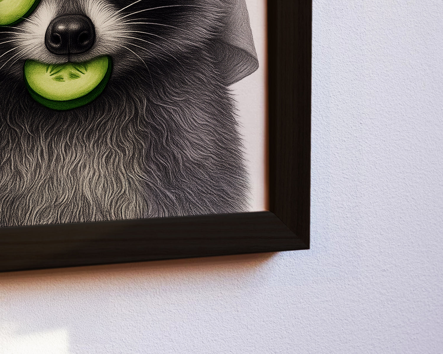 Dieses Poster bringt Spaß und Entspannung an jede Wand: Der charmante Waschbär genießt sichtbar sein kleines Spa-Ritual, komplett mit sorgfältig platzierten Gurkenscheiben auf Augen und Mund sowie einem weich gezeichneten Handtuch-Turban auf dem Kopf. Die feine Schwarz-Weiß Illustration fängt Fellstruktur und Gesichtsausdruck detailreich ein und verleiht dem Bild eine elegante, humorvolle Note. Ideal, um Badezimmer, Schlafzimmer oder sogar deinen Wellnessbereich aufzuwerten.