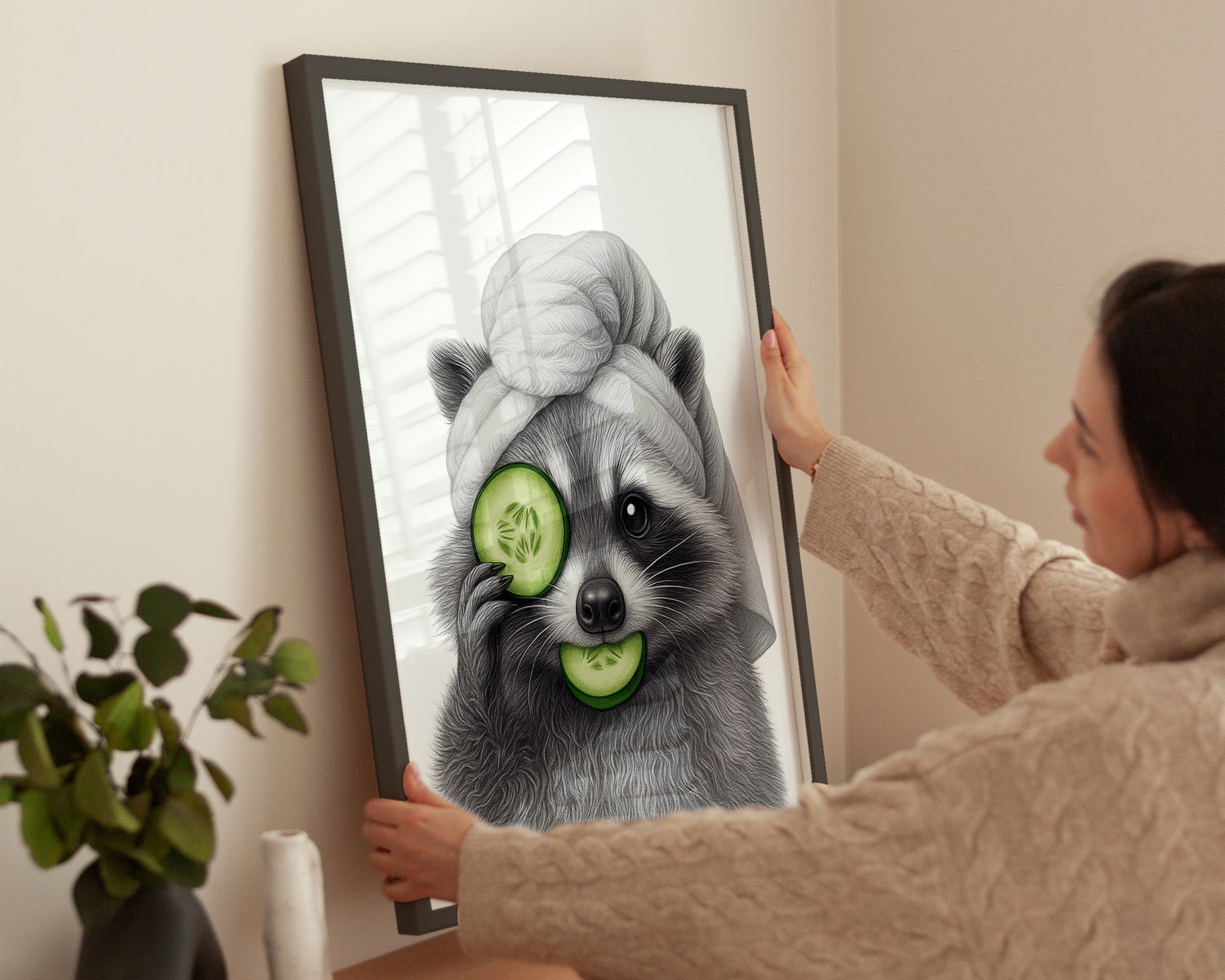 Waschbär mit Gurkenscheiben und Handtuch Poster