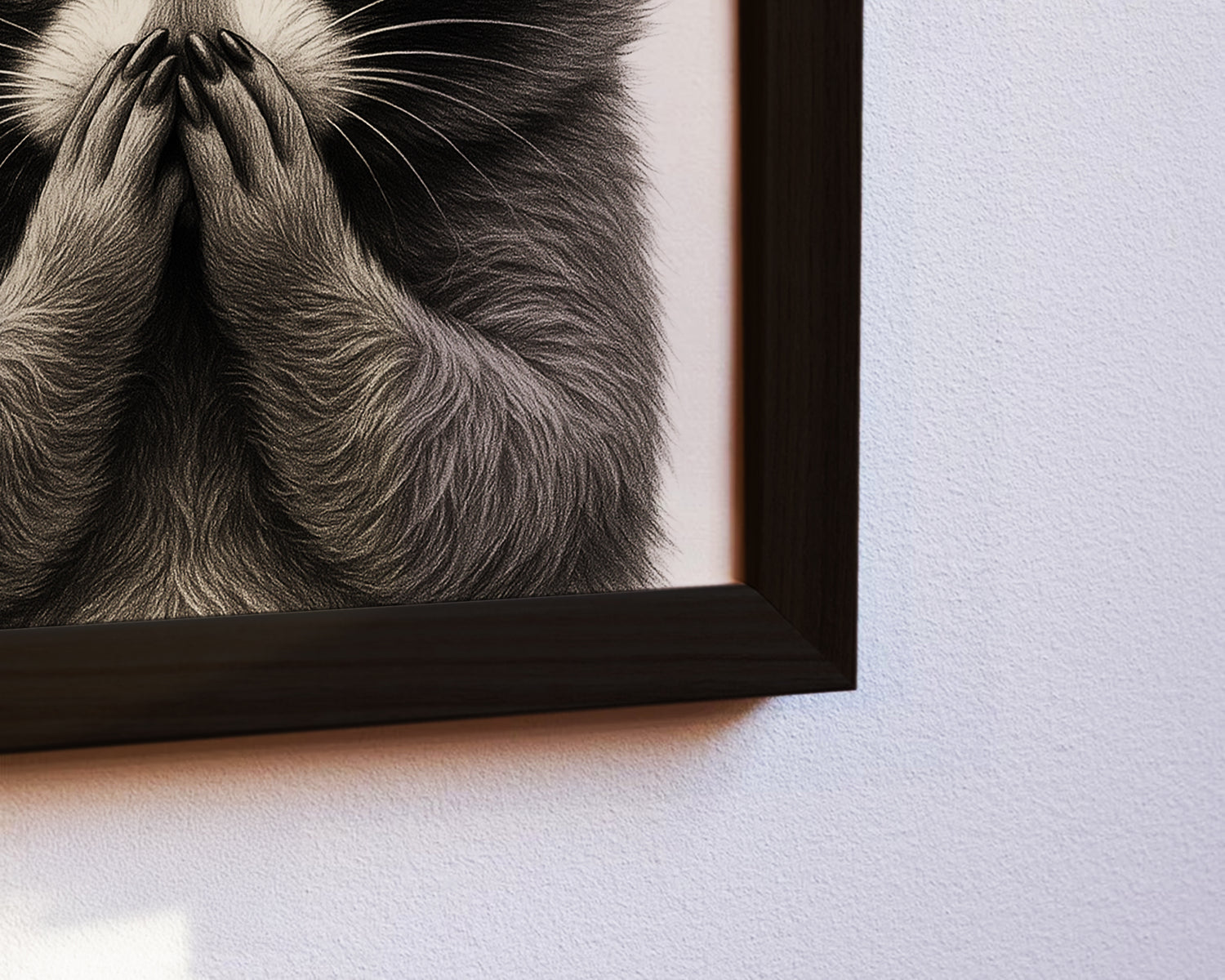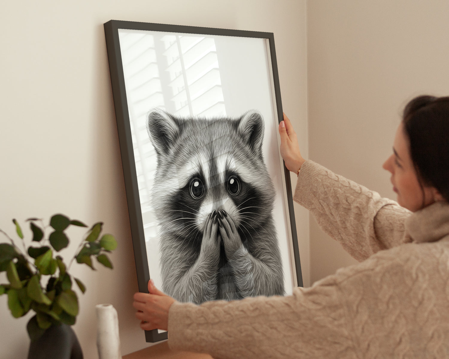 Dieses liebevoll illustrierte Poster zeigt einen Waschbären, der mit großen, erstaunten Augen den Betrachter ansieht und sich schelmisch die Hände vor den Mund hält, als hätte er gerade ein Geheimnis ausgeplaudert. Die detaillierte Schwarz-Weiß Zeichnung fängt das weiche Fell und die typische Waschbärmaske perfekt ein. Ein humorvolles und zugleich stilvolles Kunstwerk, das Wohnzimmer, Schlafzimmer oder den Eingangsbereich auf charmante Weise schmückt.